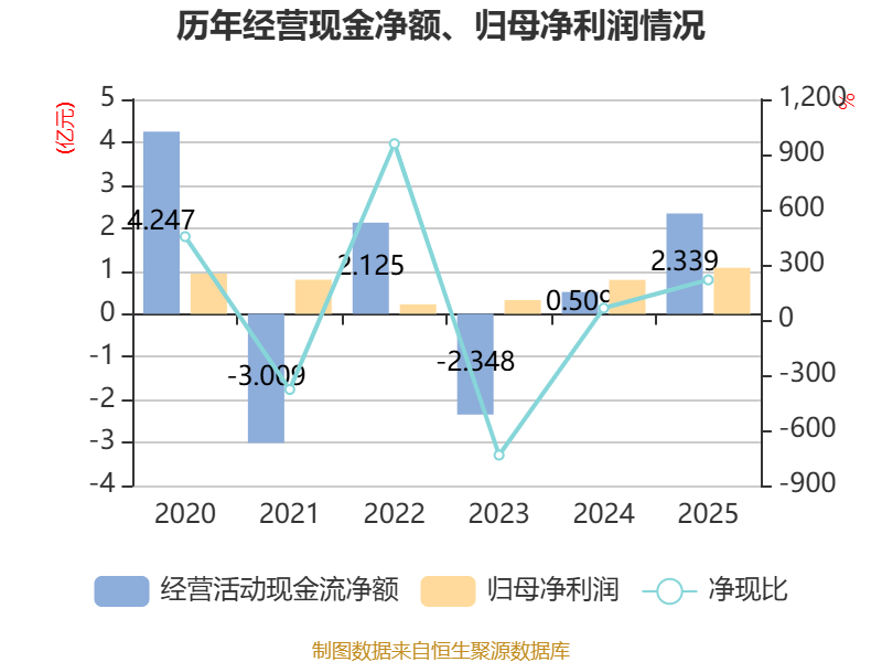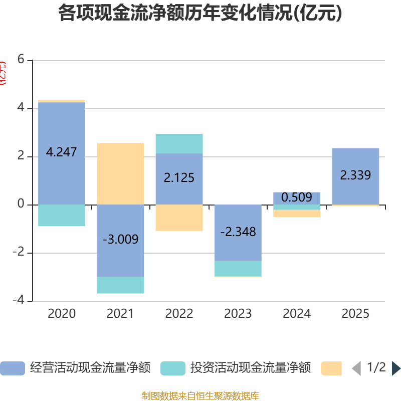 截至2025年,公司经营活动现金流净额为2.34亿元,同比增长360.02%;筹资活动现金流净额-580.52万元,同比增加2428.89万元;投资活动现金流净额-27.92万元,上年同期为-2226万元。