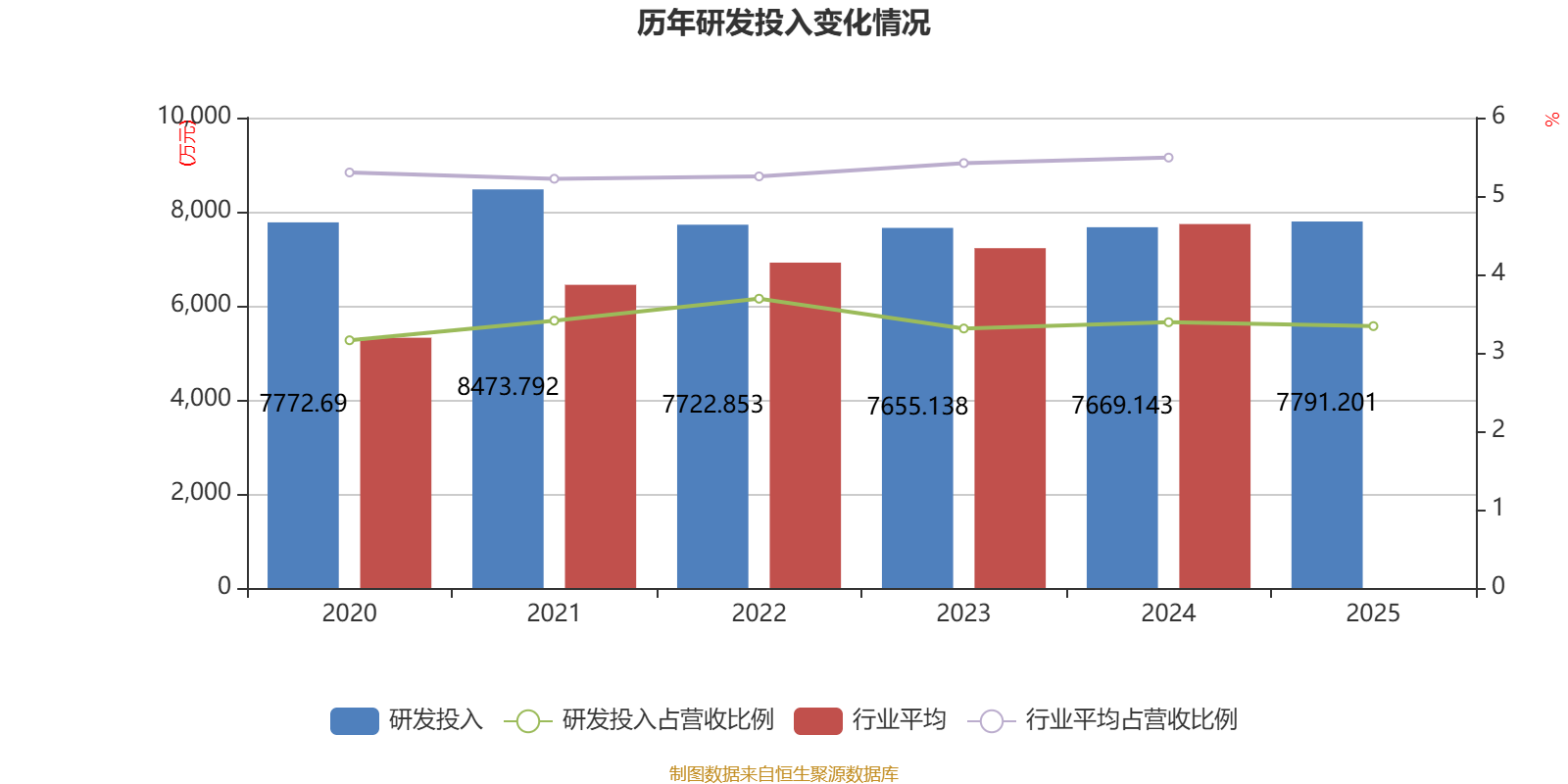 2025年全年,公司研发投入金额为7791.2万元,同比增长1.59%;研发投入占营业收入比例为3.34%,相比上年同期下降0.05个百分点。此外,公司全年研发投入资本化率为0%。