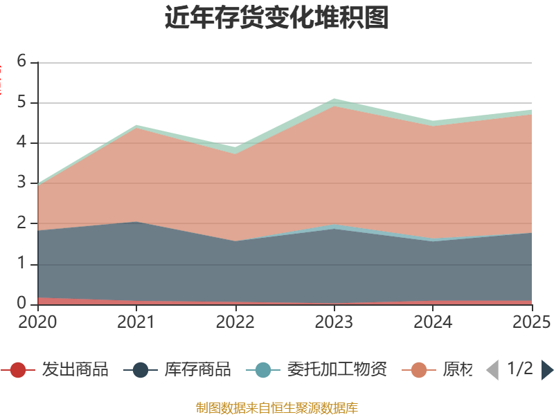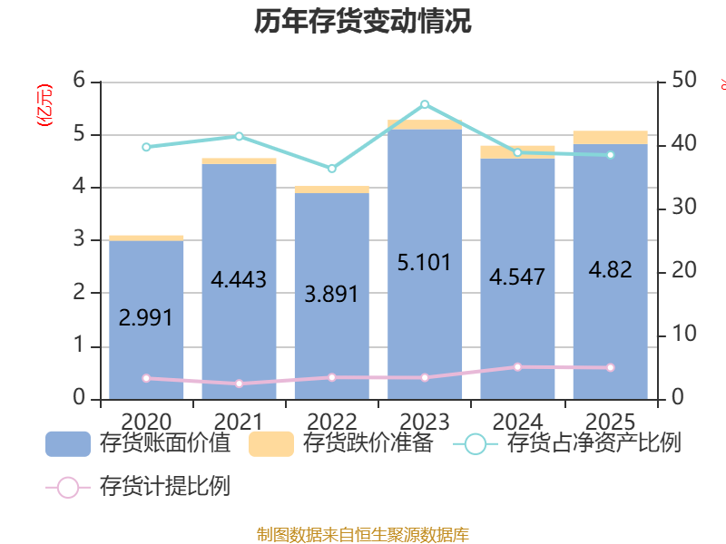 从存货变动来看,截至2025年末,公司存货账面价值为4.82亿元,占净资产的38.44%,较上年末增加2733.44万元。其中,存货跌价准备为2502.67万元,计提比例为4.94%。