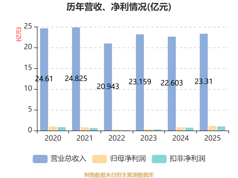 中证智能财讯新柴股份(301032)4月23日披露2025年年度报告。2025年,公司实现营业总收入23.31亿元,同比增长3.13%;归母净利润1.07亿元,同比增长35.63%;扣非净利润9898.16万元,同比增长40.92%;经营活动产生的现金流量净额为2.34亿元,同比增长360.02%;报告期内,新柴股份基本每股收益为0.44元,加权平均净资产收益率为8.85%。公司2025年度分配预案为:拟向全体股东每10股派现1.3元(含税)。