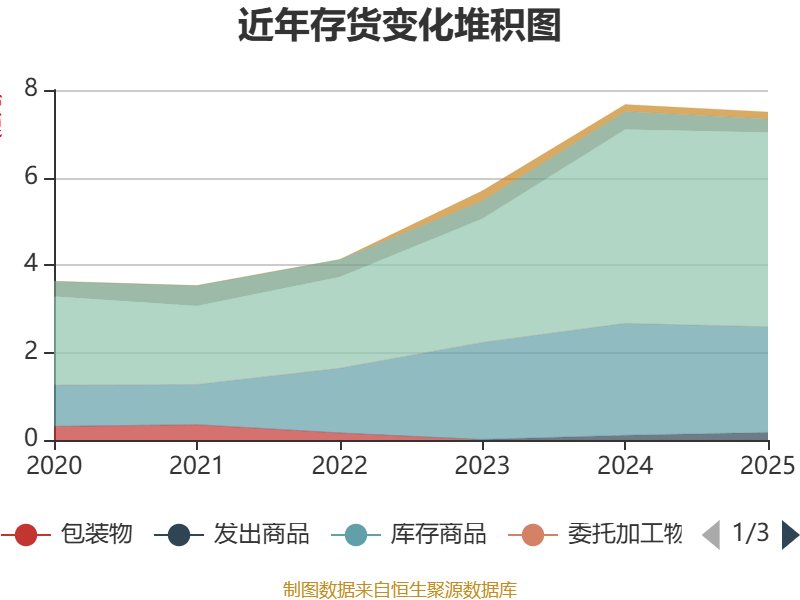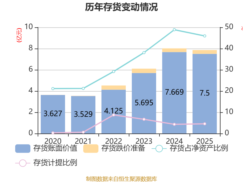 从存货变动来看,截至2025年末,公司存货账面价值为7.5亿元,占净资产的45.94%,较上年末减少1696.61万元。其中,存货跌价准备为3577.06万元,计提比例为4.55%。
