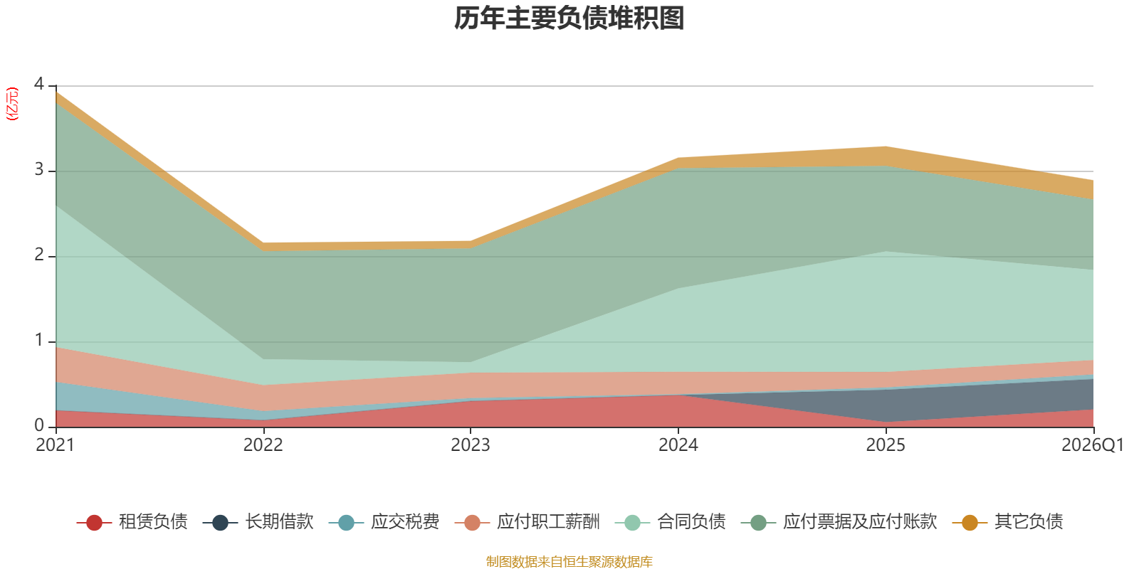 负债重大变化方面,截至2026年一季度末,公司合同负债较上年末减少25.22%,占公司总资产比重下降1.79个百分点;租赁负债较上年末增加269.89%,占公司总资产比重上升0.85个百分点;应付票据及应付账款较上年末减少17.73%,占公司总资产比重下降0.84个百分点;应交税费较上年末增加100.25%,占公司总资产比重上升0.16个百分点。