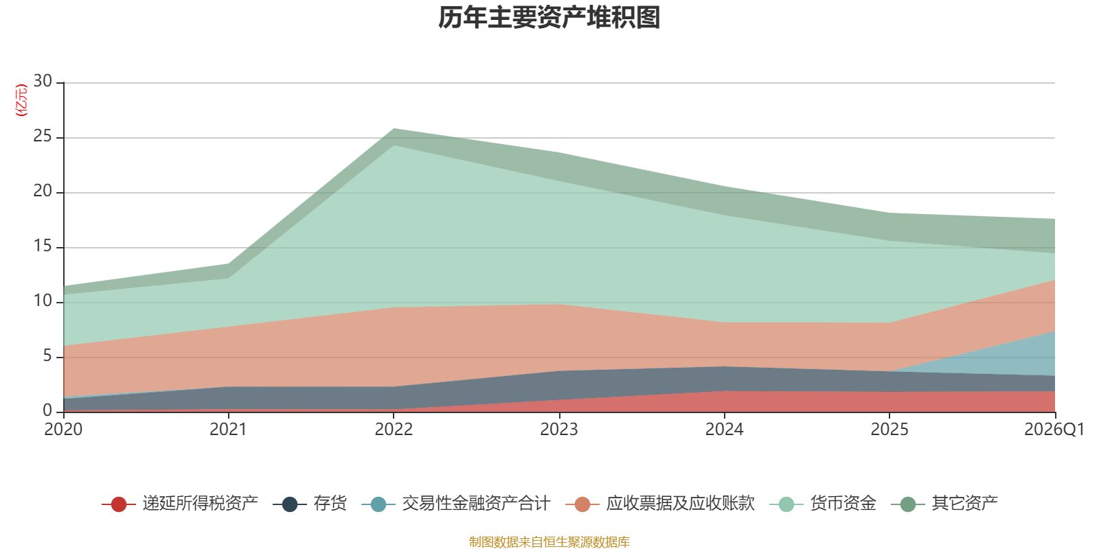 资产重大变化方面,截至2026年一季度末,公司货币资金较上年末减少67.85%,占公司总资产比重下降27.52个百分点;交易性金融资产合计占公司总资产的23.03%,上年末为0;预付款项较上年末增加263.81%,占公司总资产比重上升2.33个百分点;应收票据及应收账款较上年末增加5.73%,占公司总资产比重上升2.21个百分点。