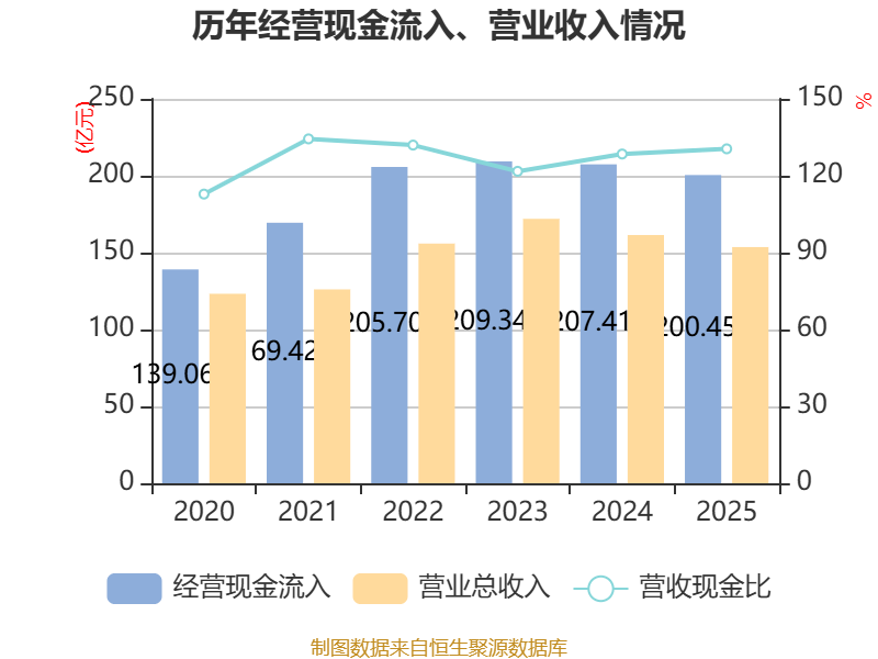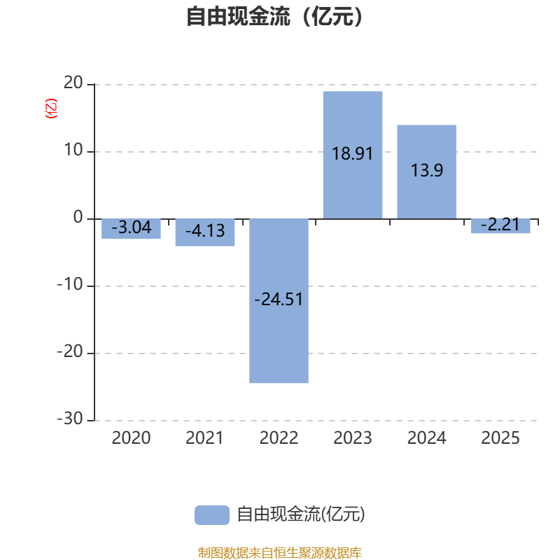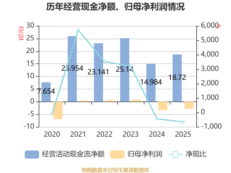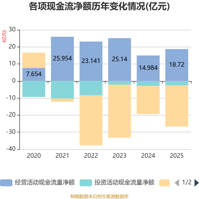 截至2025年,公司经营活动现金流净额为18.72亿元,同比增长24.93%;筹资活动现金流净额-24.13亿元,同比减少7.6亿元;投资活动现金流净额-2.57亿元,上年同期为-2.83亿元。