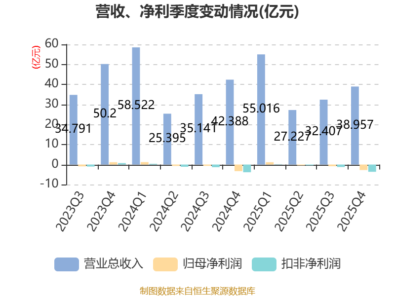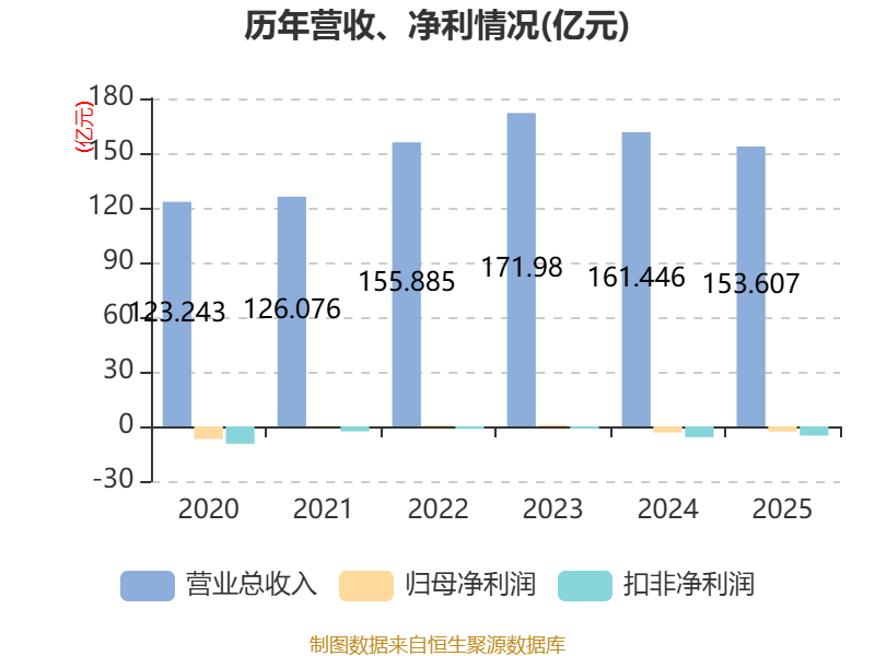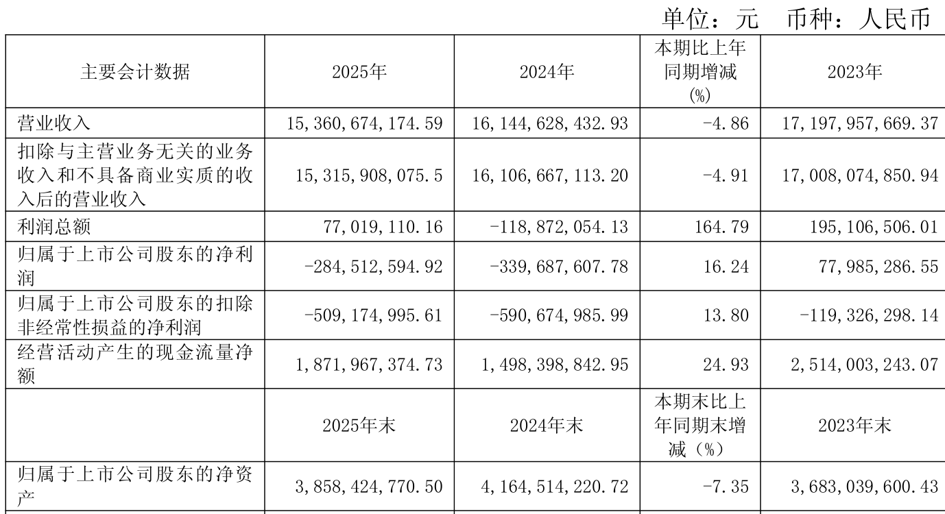 中证智能财讯国新能源(600617)4月23日披露2025年年度报告。2025年,公司实现营业总收入153.61亿元,同比下降4.86%;归母净利润亏损2.85亿元,上年同期亏损3.4亿元;扣非净利润亏损5.09亿元,上年同期亏损5.91亿元;经营活动产生的现金流量净额为18.72亿元,同比增长24.93%;报告期内,国新能源基本每股收益为-0.16元,加权平均净资产收益率为-9.55%。