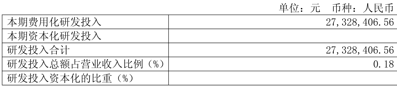 2025年全年,公司研发投入金额为2732.84万元,同比增长42.56%;研发投入占营业收入比例为0.18%,相比上年同期上升0.06个百分点。此外,公司全年研发投入资本化率为0%。