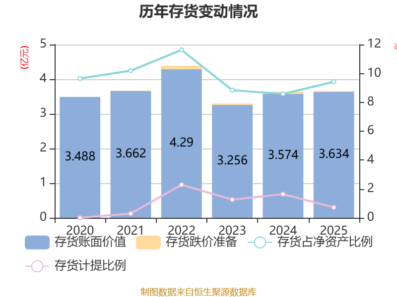 从存货变动来看,截至2025年末,公司存货账面价值为3.63亿元,占净资产的9.42%,较上年末增加601.78万元。其中,存货跌价准备为262.15万元,计提比例为0.72%。