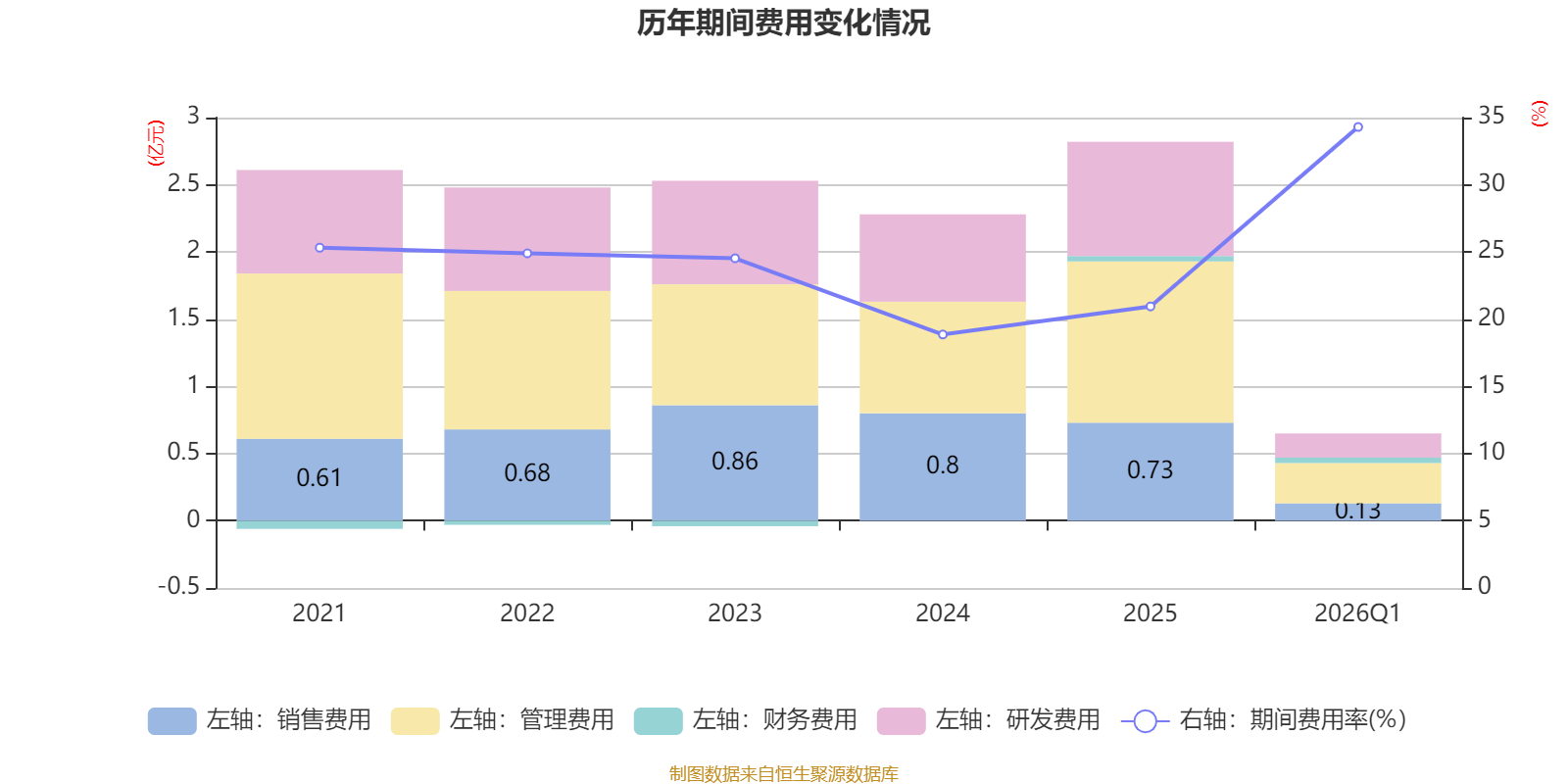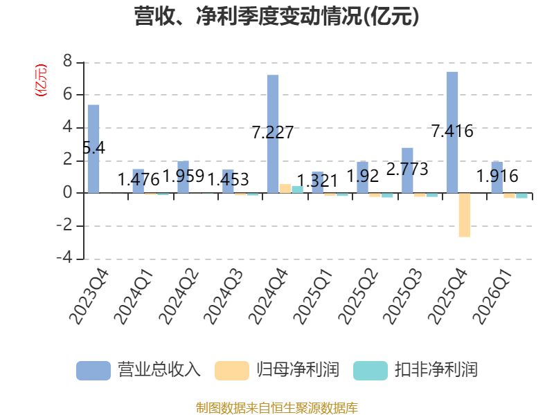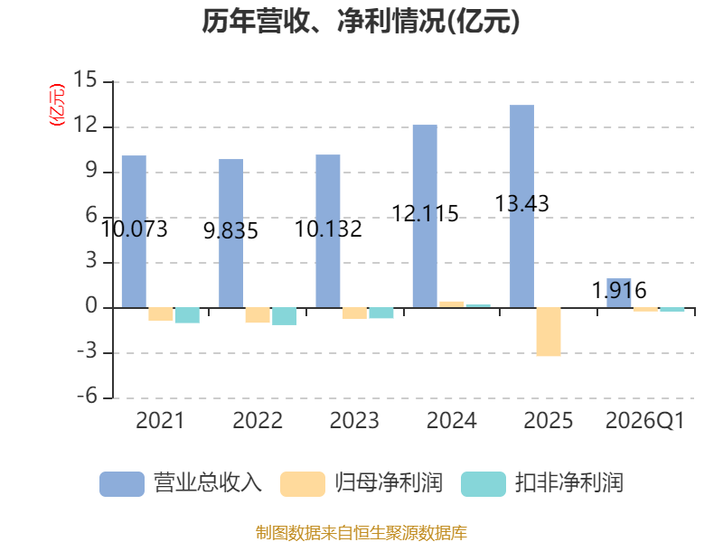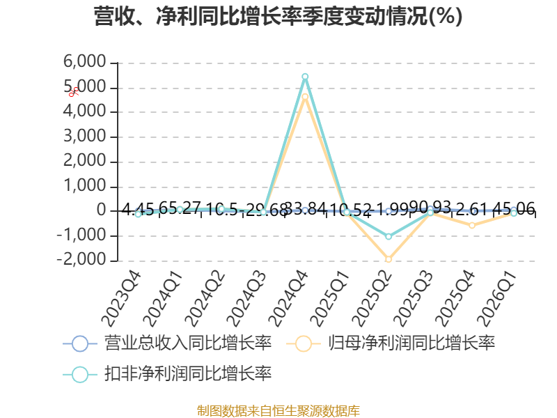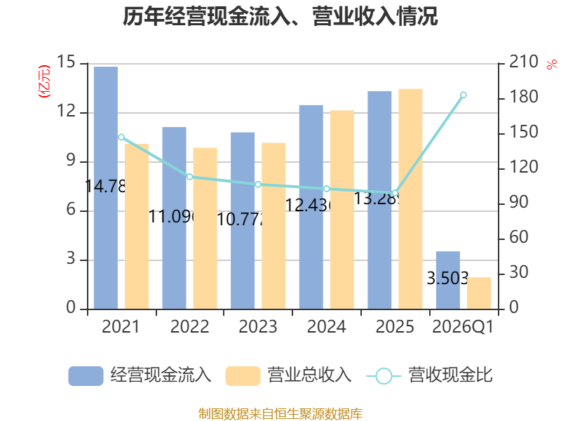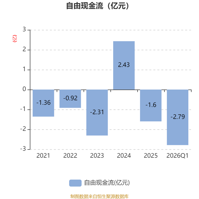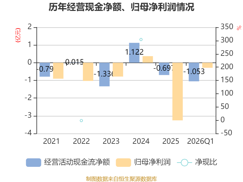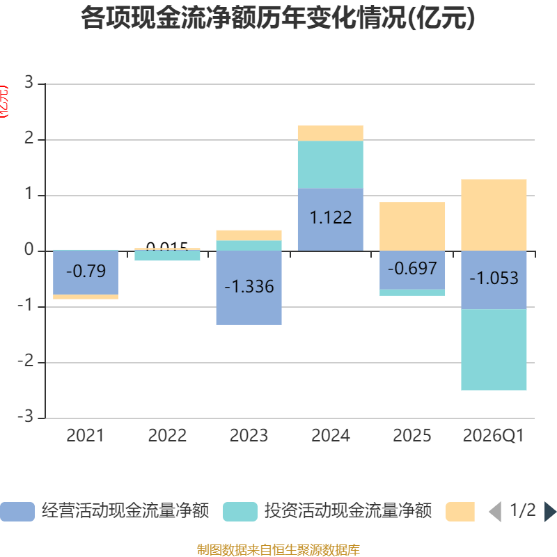 截至2026年一季度末,公司经营活动现金流净额为-1.05亿元,同比减少6580.88万元;筹资活动现金流净额1.28亿元,同比增加4840.17万元;投资活动现金流净额-1.45亿元,上年同期为-1.51亿元。