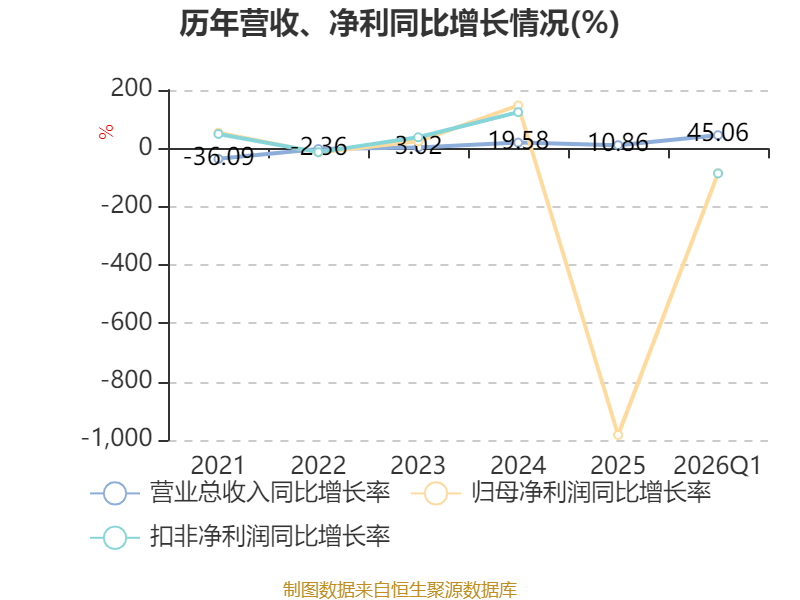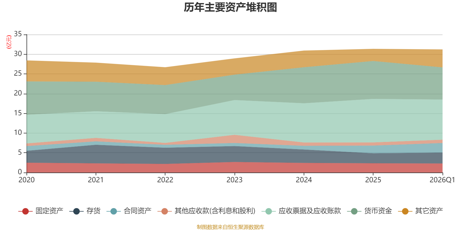 资产重大变化方面,截至2026年一季度末,公司货币资金较上年末减少15.19%,占公司总资产比重下降4.54个百分点;应收票据及应收账款较上年末减少7.77%,占公司总资产比重下降2.59个百分点;交易性金融资产合计较上年末增加228.7%,占公司总资产比重上升2.58个百分点;其他非流动金融资产较上年末增加1365.24%,占公司总资产比重上升1.92个百分点。