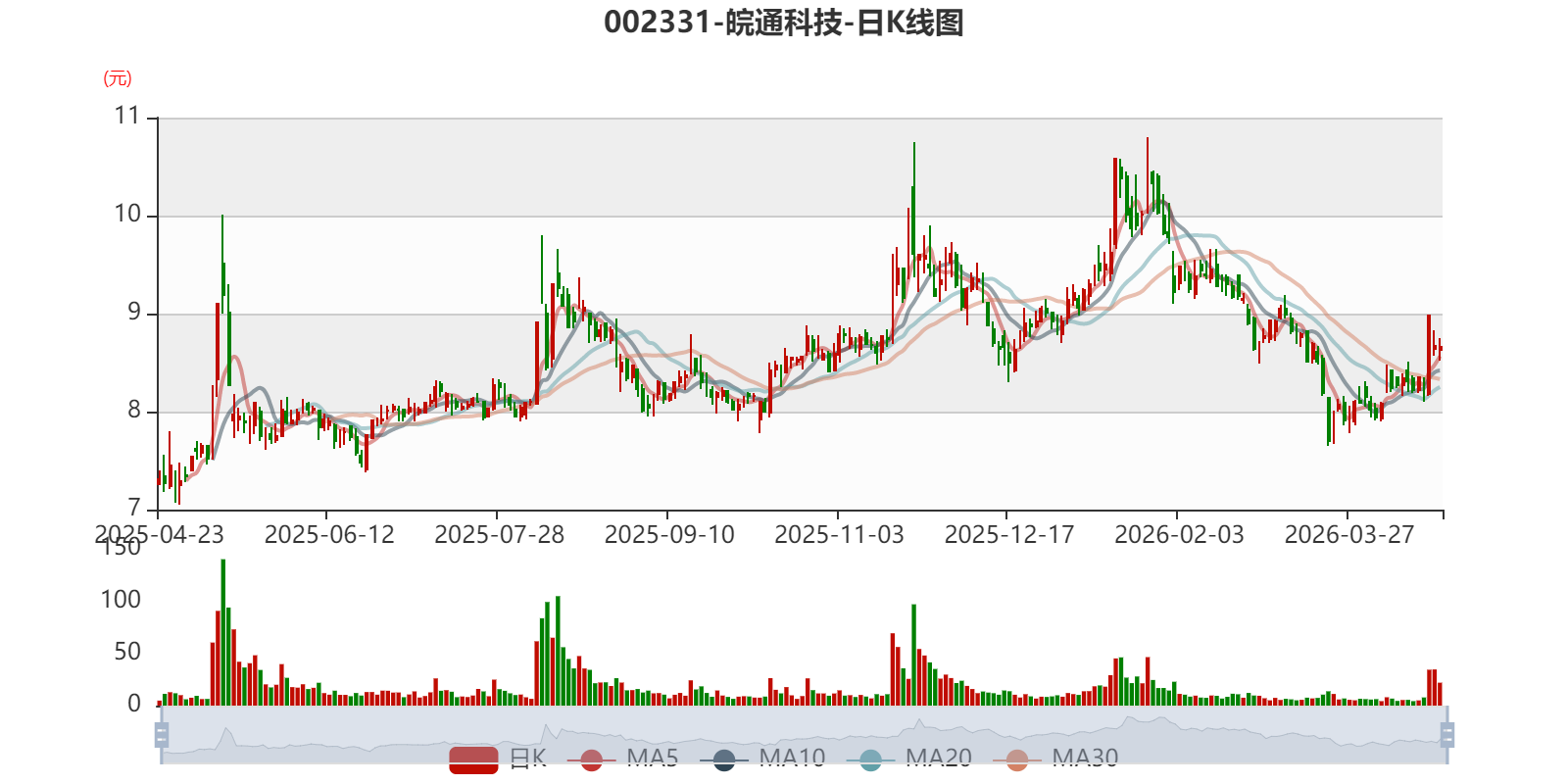 中证智能财讯皖通科技(002331)4月23日披露2026年第一季度报告。公司实现营业总收入1.92亿元,同比增长45.06%;归母净利润亏损2884.47万元,上年同期亏损1558.42万元;扣非净利润亏损2982.03万元,上年同期亏损1603.12万元;经营活动产生的现金流量净额为-1.05亿元,上年同期为-3947.19万元;报告期内,皖通科技基本每股收益为-0.0673元,加权平均净资产收益率为-1.99%。