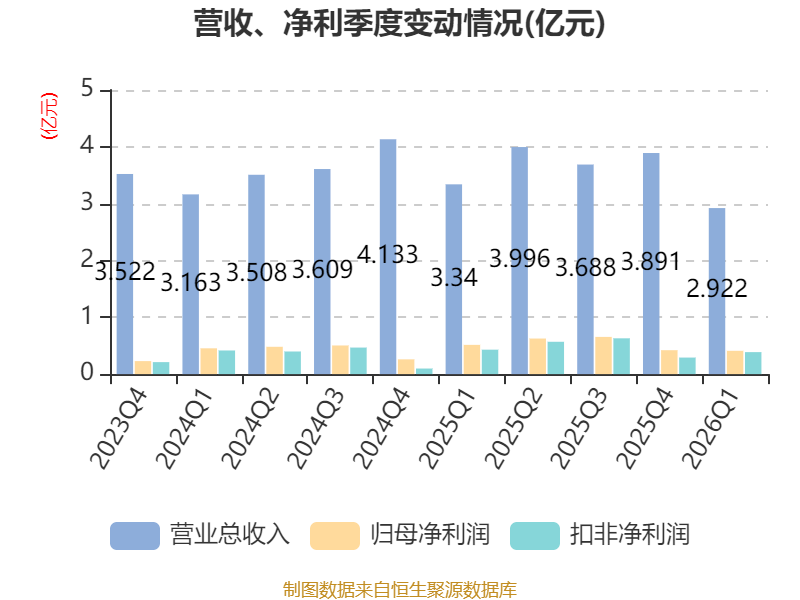 中证智能财讯道明光学(002632)4月23日披露2026年第一季度报告。公司实现营业总收入2.92亿元,同比下降12.50%;归母净利润4099.58万元,同比下降20.32%;扣非净利润3874.99万元,同比下降9.97%;经营活动产生的现金流量净额为6113.37万元,同比下降7.42%;报告期内,道明光学基本每股收益为0.0656元,加权平均净资产收益率为1.86%。