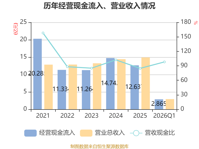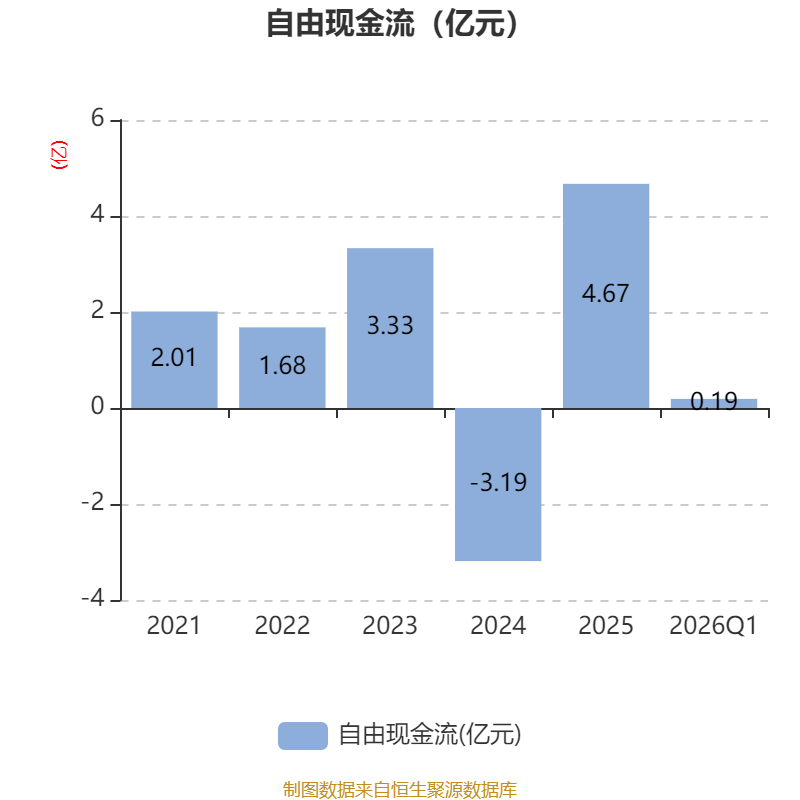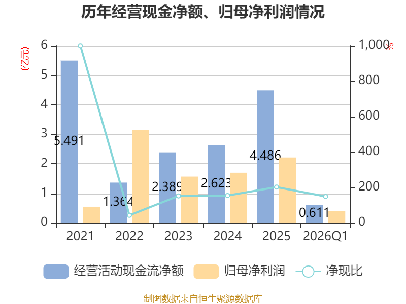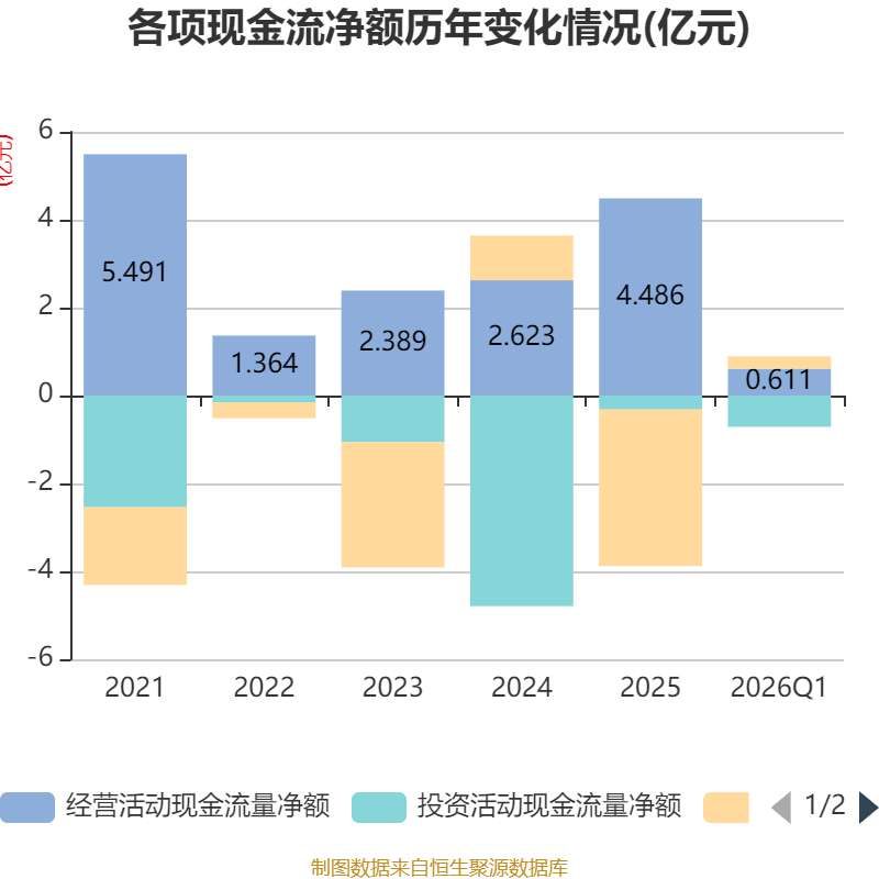 截至2026年一季度末,公司经营活动现金流净额为6113.37万元,同比下降7.42%;筹资活动现金流净额2799.33万元,同比减少2.79亿元;投资活动现金流净额-7126.03万元,上年同期为-1.98亿元。