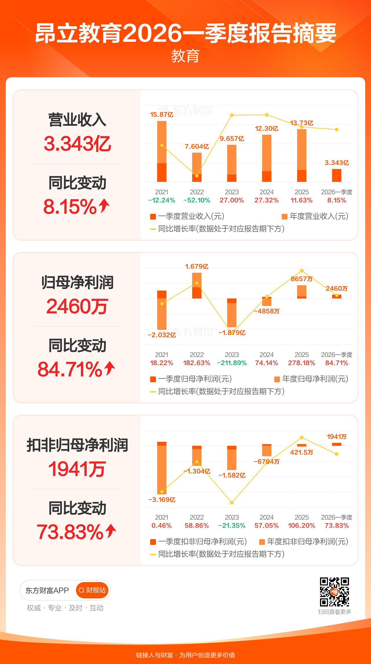 昂立教育4月23日发布2026年一季报显示,公司一季度实现营业收入3.34亿元,同比增长8.15%;归母净利润2460.48万元,同比增长84.71%;扣非归母净利润1941.44万元,同比增长73.83%。