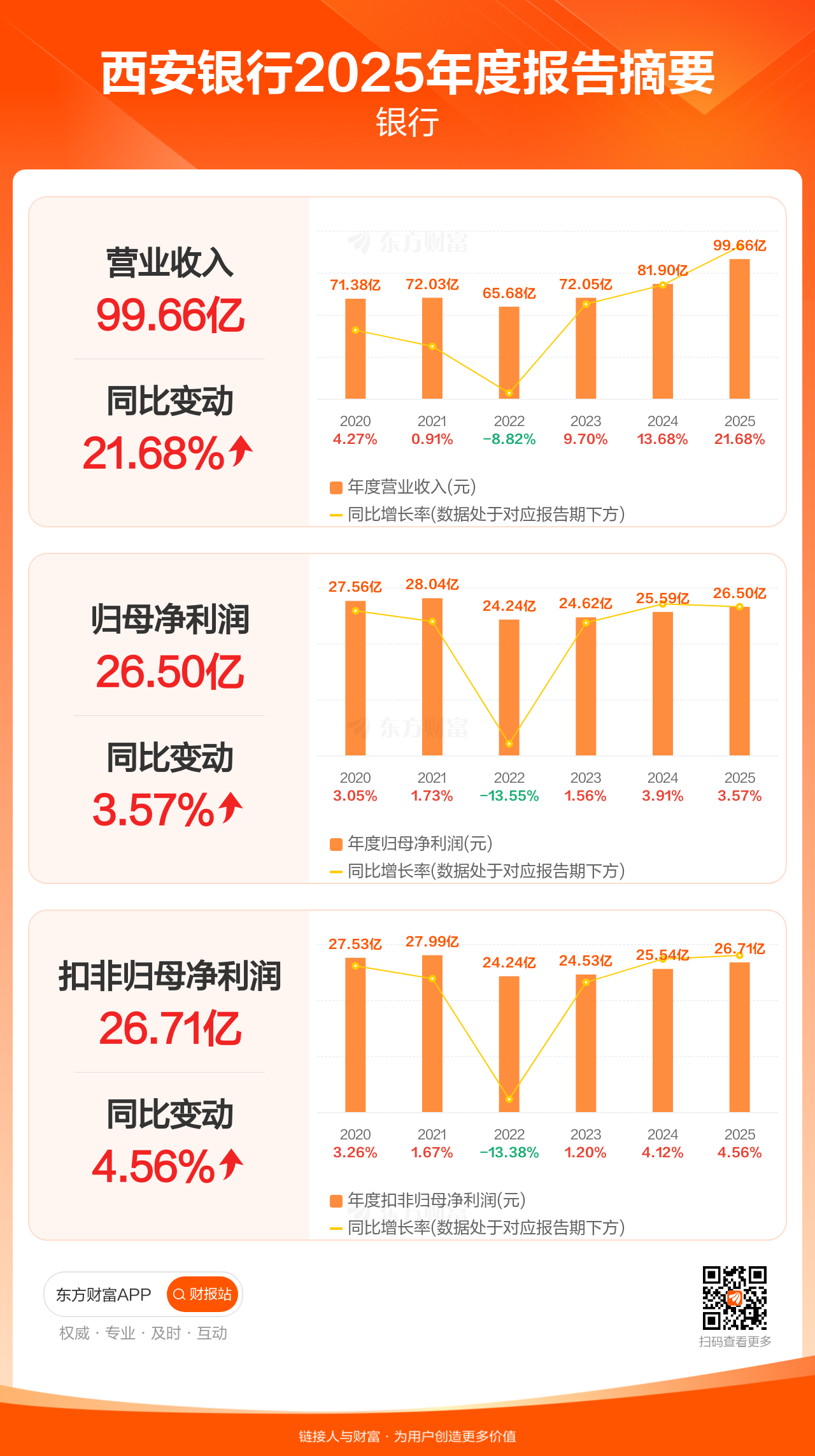 西安银行4月23日发布2025年年报显示,公司全年实现营业收入99.66亿元,同比增长21.68%;归母净利润26.50亿元,同比增长3.57%;扣非归母净利润26.71亿元,同比增长4.56%。