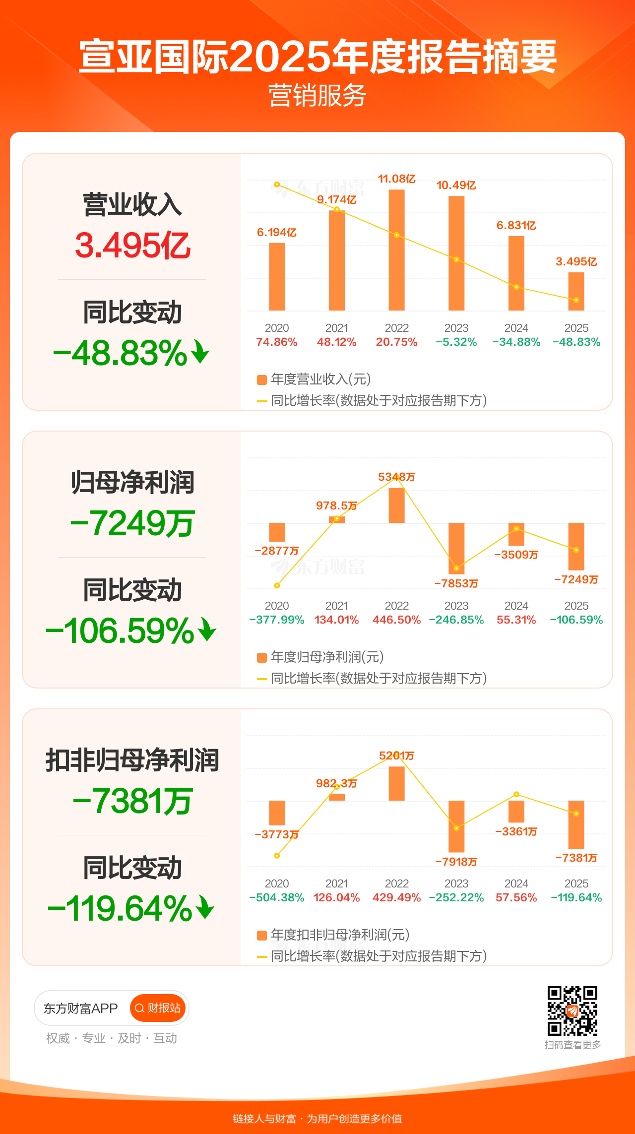 宣亚国际4月23日发布2025年年报显示,公司全年实现营业收入3.50亿元,同比下滑48.83%;归母净利润-7249.49万元;扣非归母净利润-7381.46万元。