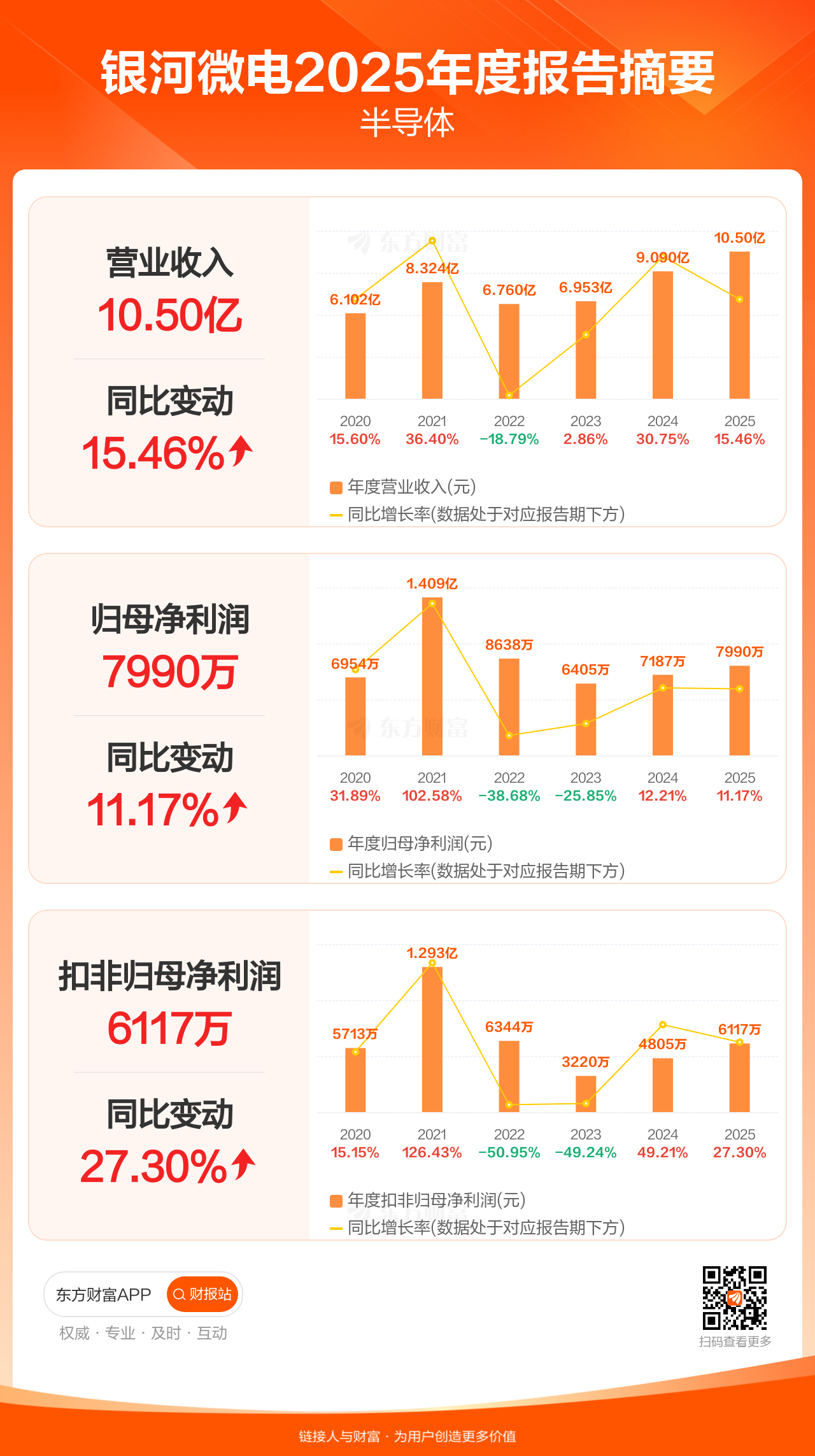 银河微电4月23日发布2025年年报显示,公司全年实现营业收入10.50亿元,同比增长15.46%;归母净利润7990.47万元,同比增长11.17%;扣非归母净利润6116.59万元,同比增长27.30%。