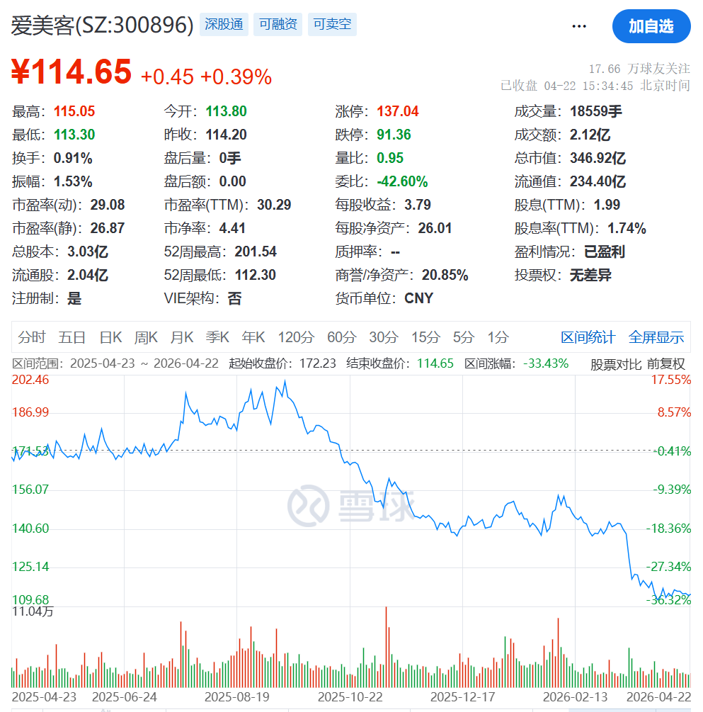 资料显示,爱美客技术发展股份有限公司于2020年9月28日上市,公司的主营业务是生物医用材料及生物医药的研发、生产和销售。公司的主要产品是Ⅲ类医疗器械、注射类皮肤填充剂产品。近一年来公司股价累计下跌约33%。