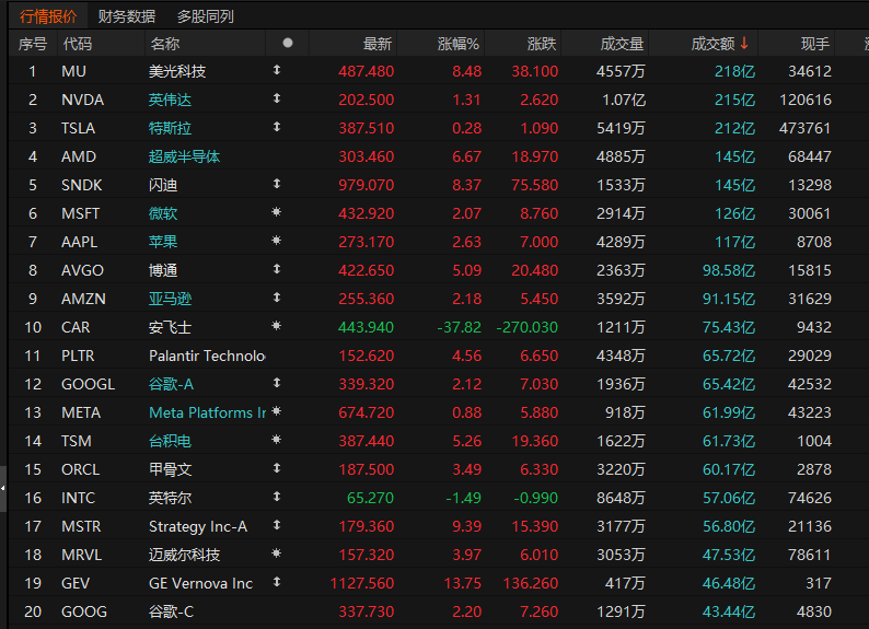 第4名AMD收高6.67%,成交145亿美元。周三美股明星科技股普涨。