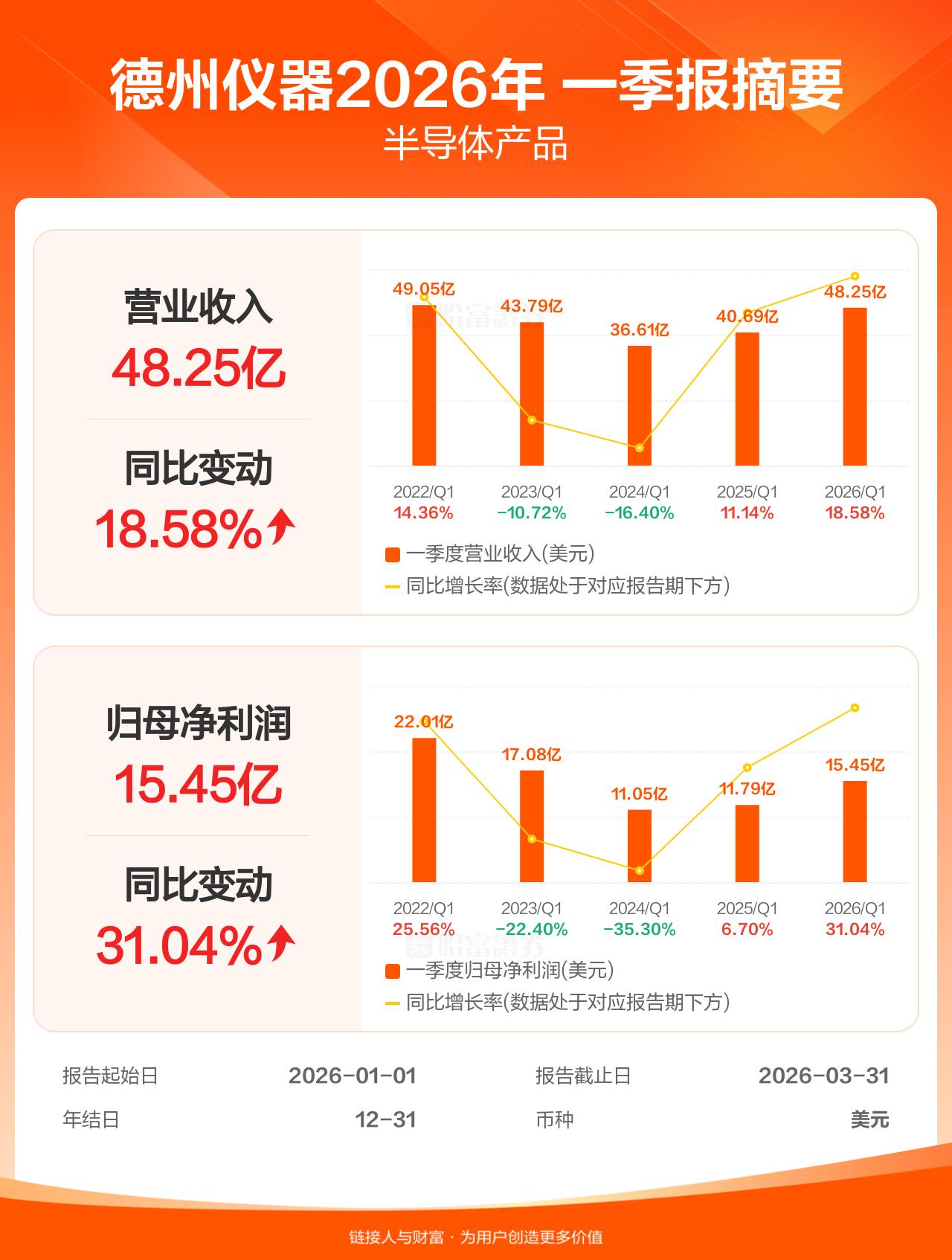 德州仪器4月22日发布一季报业绩,截至2026年3月31日的3个月内,该公司营业收入48.25亿美元,同比增长18.58%;公司权益持有人应占溢利(归母净利润)15.45亿美元,同比增长31.04%。