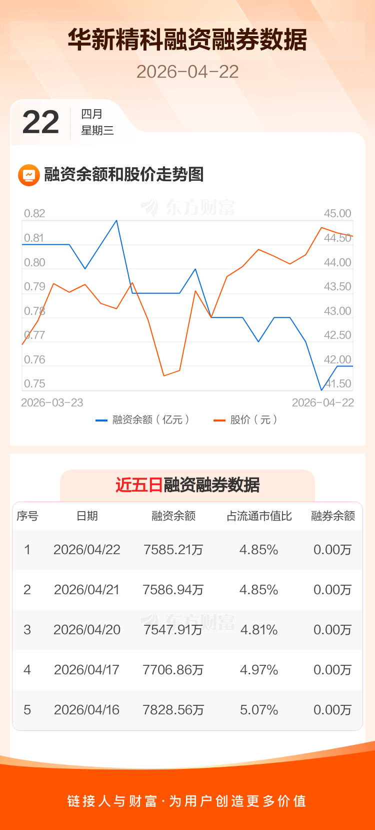 交易所最新数据显示,华新精科于2026年4月22日获融资买入154.38万元,融资偿还156.11万元,当日融资净偿还1.73万元。目前,该股融资余额7585.21万,占流通市值比例为4.85%。