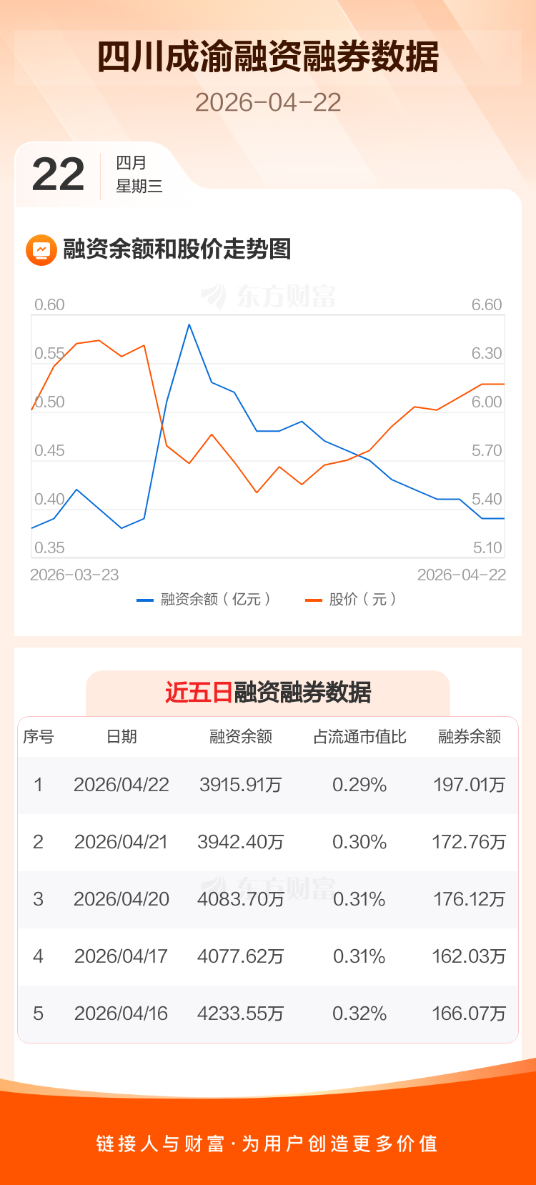 交易所最新数据显示,四川成渝于2026年4月22日获融资买入238.44万元,融资偿还264.93万元,当日融资净偿还26.49万元。目前,该股融资余额3915.91万,占流通市值比例为0.29%。