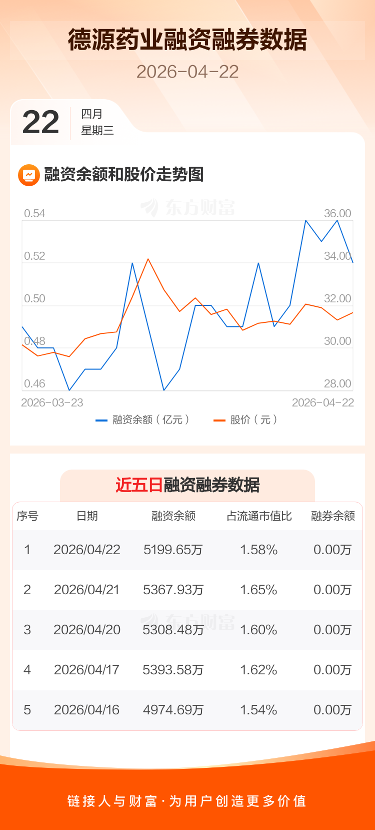 交易所最新数据显示,德源药业于2026年4月22日获融资买入258.22万元,融资偿还426.51万元,当日融资净偿还168.29万元。目前,该股融资余额5199.65万,占流通市值比例为1.58%。