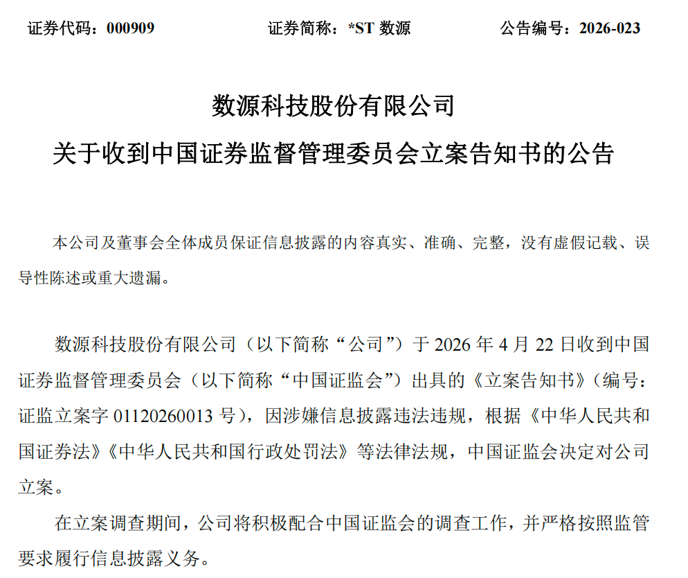 *ST数源(000909)同日公告,公司当日收到证监会出具的立案告知书。因涉嫌信息披露违法违规,证监会决定对公司立案。在立案调查期间,公司将积极配合证监会的调查工作,并严格按照监管要求履行信息披露义务。