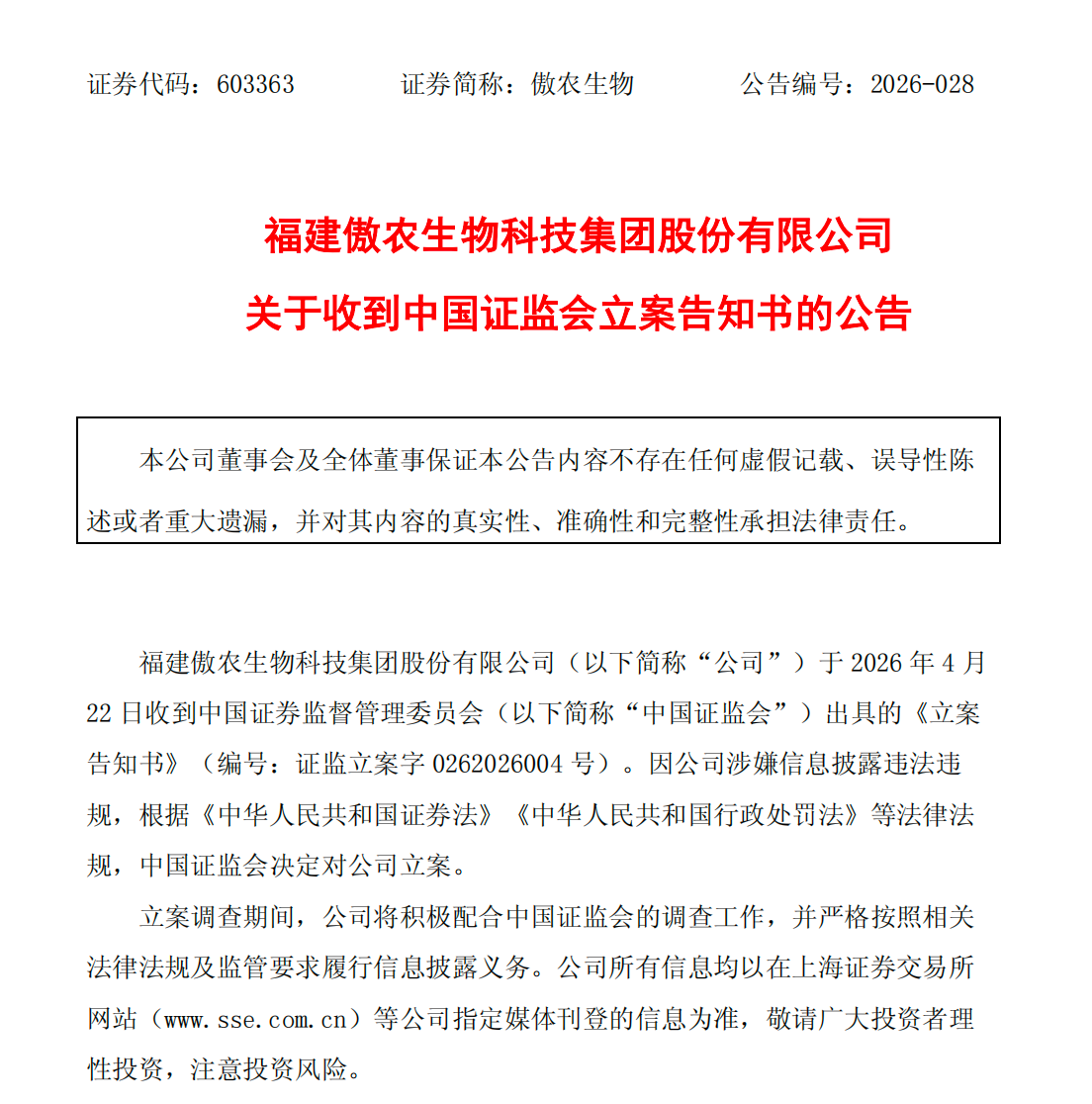 傲农生物(603363)4月22日公告称,公司于当日收到证监会出具的立案告知书,因公司涉嫌信息披露违法违规,证监会决定对公司立案。立案调查期间,公司将积极配合证监会的调查工作,并严格按照相关法律法规及监管要求履行信息披露义务。