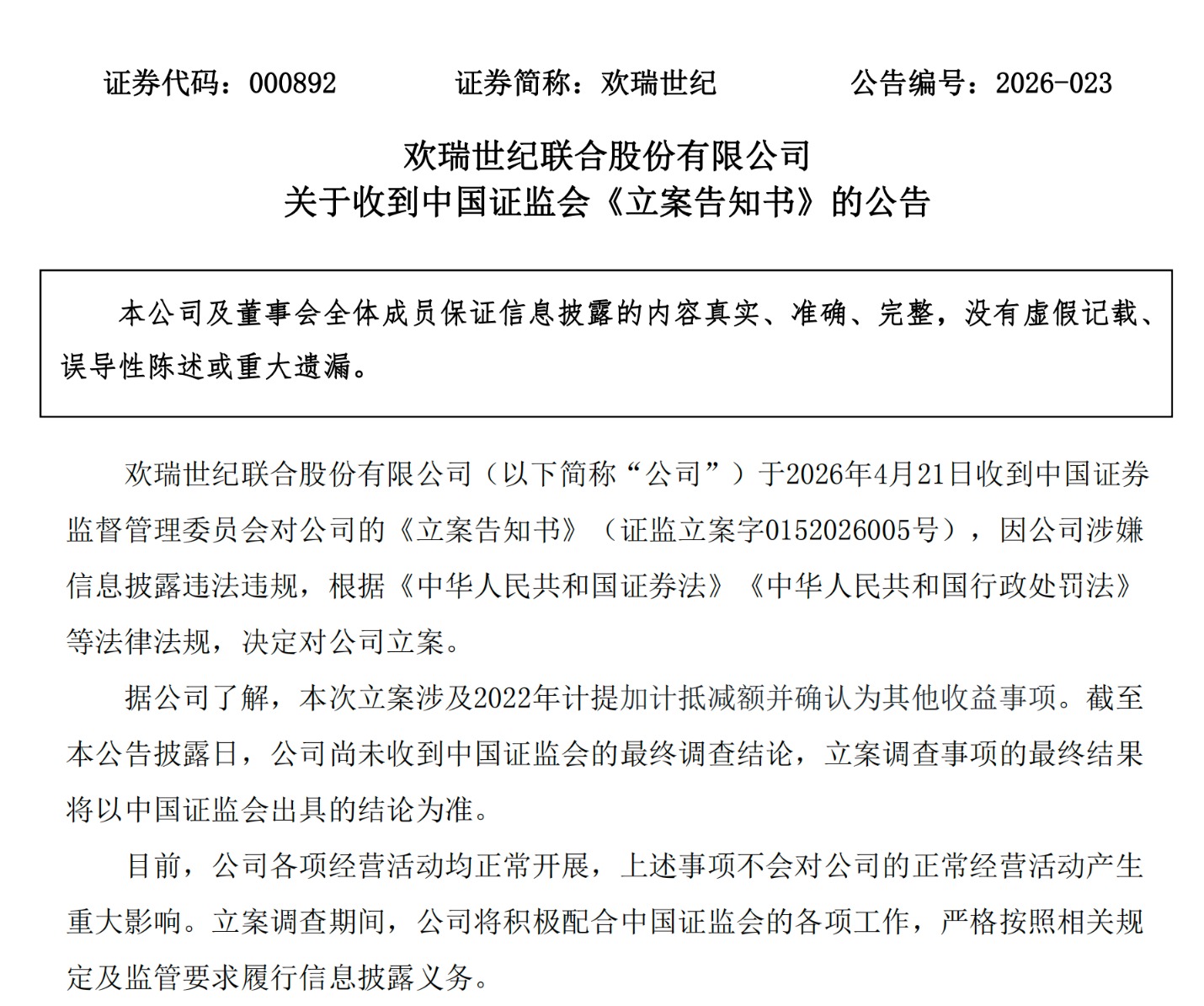 欢瑞世纪(000892)4月22日公告,公司于4月21日收到证监会立案告知书。因公司涉嫌信息披露违法违规,证监会决定对公司立案。据了解,本次立案涉及2022年计提加计抵减额并确认为其他收益事项。截至公告披露日,公司尚未收到证监会的最终调查结论,最终结果以证监会出具的结论为准。目前,公司各项经营活动均正常开展,上述事项不会对公司的正常经营活动产生重大影响。立案调查期间,公司将积极配合证监会各项工作,严格按照相关规定及监管要求履行信息披露义务。