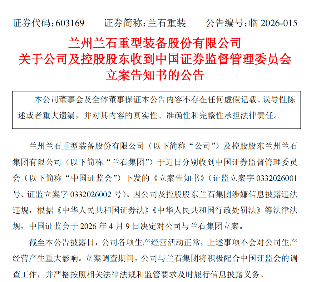 兰石重装(603169)4月22日公告,公司及控股股东兰石集团于近日分别收到证监会下发的立案告知书。因公司及控股股东兰石集团涉嫌信息披露违法违规,证监会于4月9日决定对公司与兰石集团立案。截至公告披露日,公司各项生产经营活动正常,上述事项不会对公司生产经营产生重大影响。立案调查期间,公司与兰石集团将积极配合证监会的调查工作,并严格按照相关法律法规和监管要求及时履行信息披露义务。