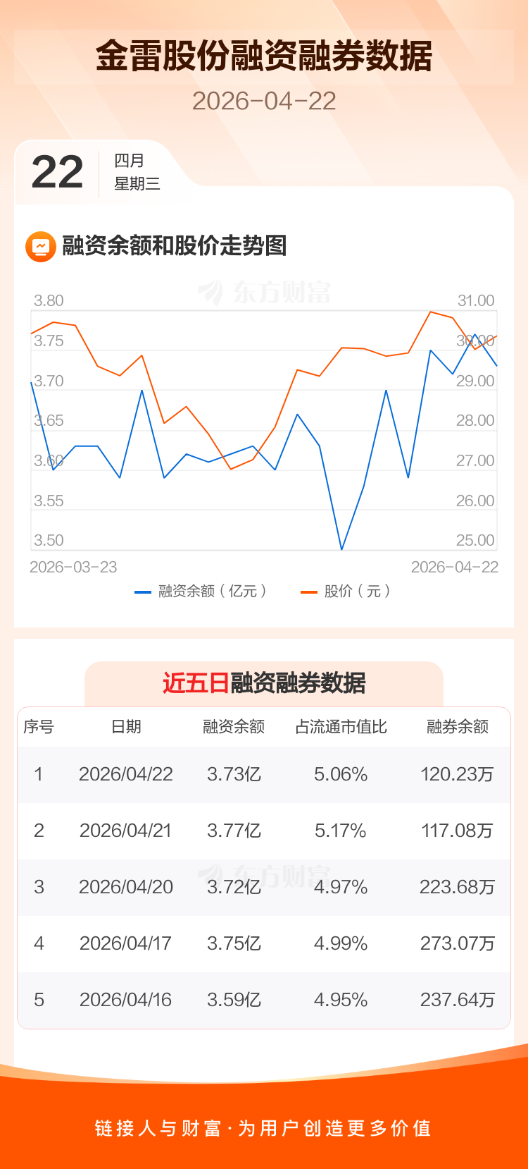 交易所最新数据显示,金雷股份于2026年4月22日获融资买入2693.38万元,融资偿还3076.29万元,当日融资净偿还382.9万元。目前,该股融资余额3.73亿,占流通市值比例为5.06%。