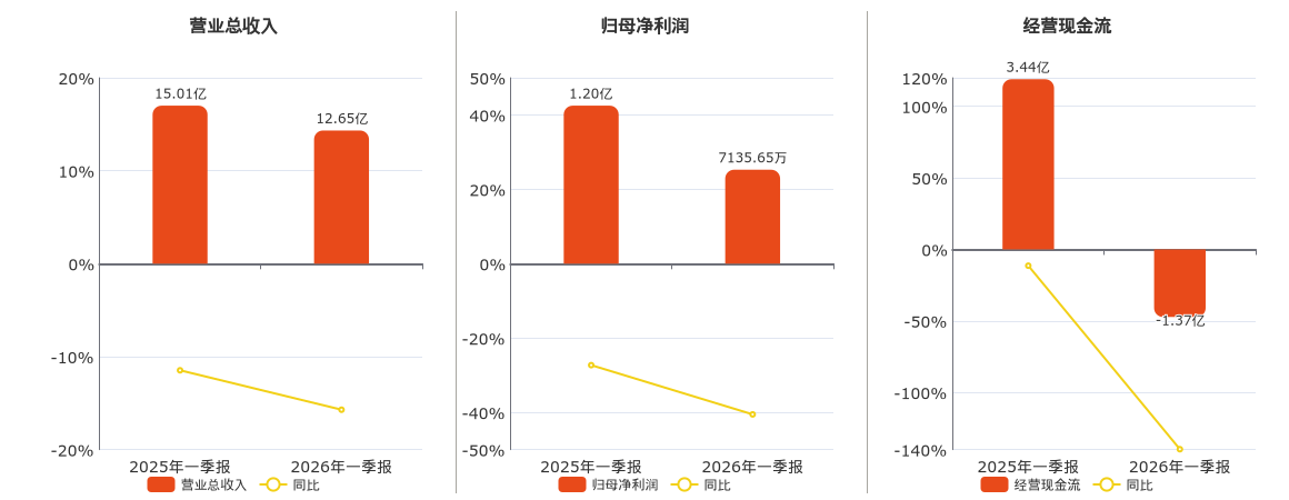 公司营业总收入为12.65亿元,较去年同报告期营业总收入减少2.36亿元,同比较去年同期下降15.71%。归母净利润为7135.65万元,较去年同报告期归母净利润减少4862.50万元,同比较去年同期下降40.53%。经营活动现金净流入为-1.37亿元,较去年同报告期经营活动现金净流入减少4.80亿元,同比较去年同期下降139.73%。