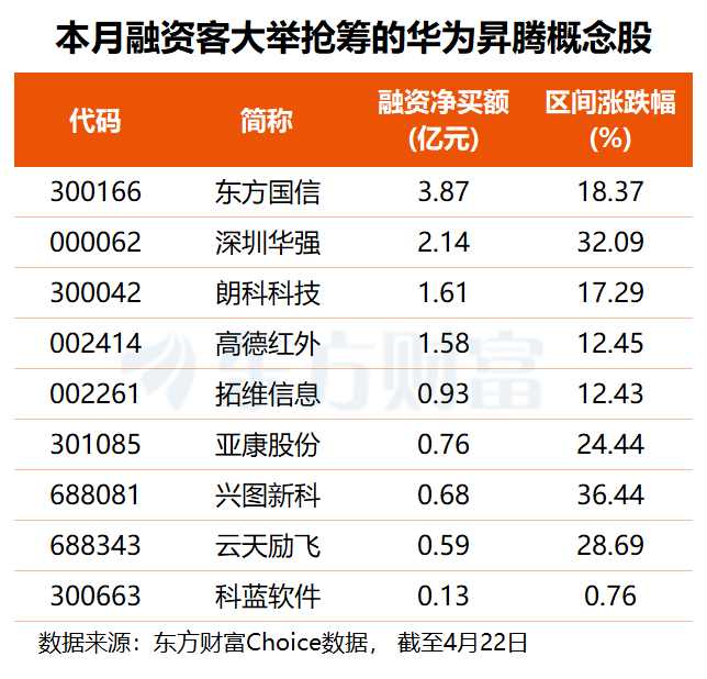 资金方面,东方财富Choice数据显示,本月共有14只华为昇腾概念股获得融资净买入,其中,东方国信获杠杆资金加仓3.87亿元,深圳华强获融资客抢筹2.14亿元,朗科科技、高德红外融资净买额均在1.6亿元上下,拓维信息也获0.93亿元融资净买入。