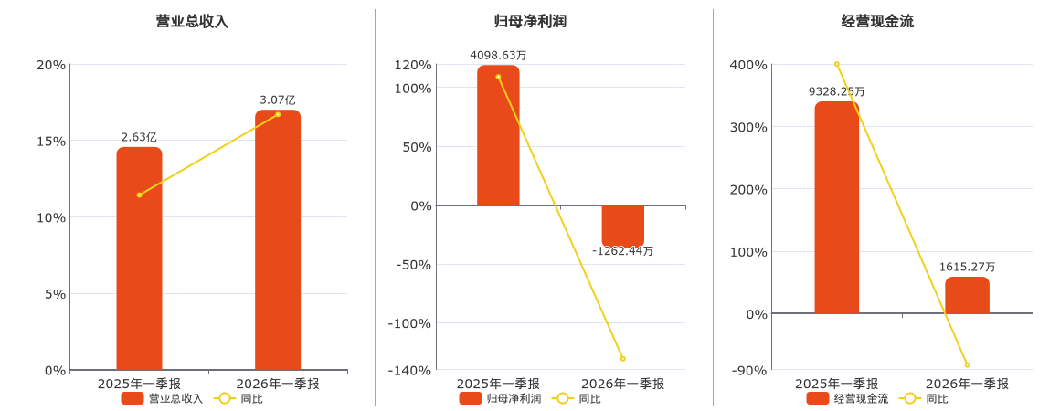 公司营业总收入为3.07亿元。归母净利润为-1262.44万元,较去年同报告期归母净利润减少5361.07万元,同比较去年同期下降130.80%。经营活动现金净流入为1615.27万元,较去年同报告期经营活动现金净流入减少7712.98万元,同比较去年同期下降82.68%。