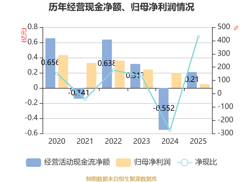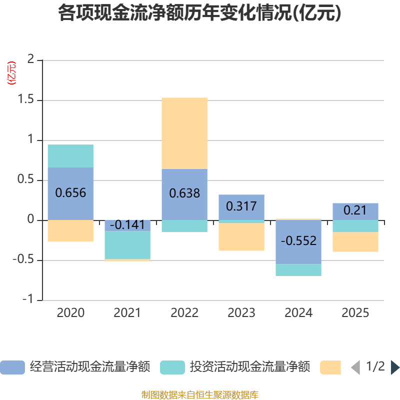 截至2025年,公司经营活动现金流净额为2104.75万元,同比增加7624.36万元;筹资活动现金流净额-2453.11万元,同比减少2626.18万元;投资活动现金流净额-1525.94万元,上年同期为-1482.48万元。