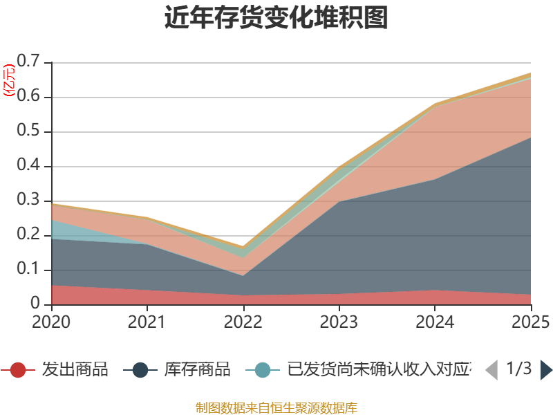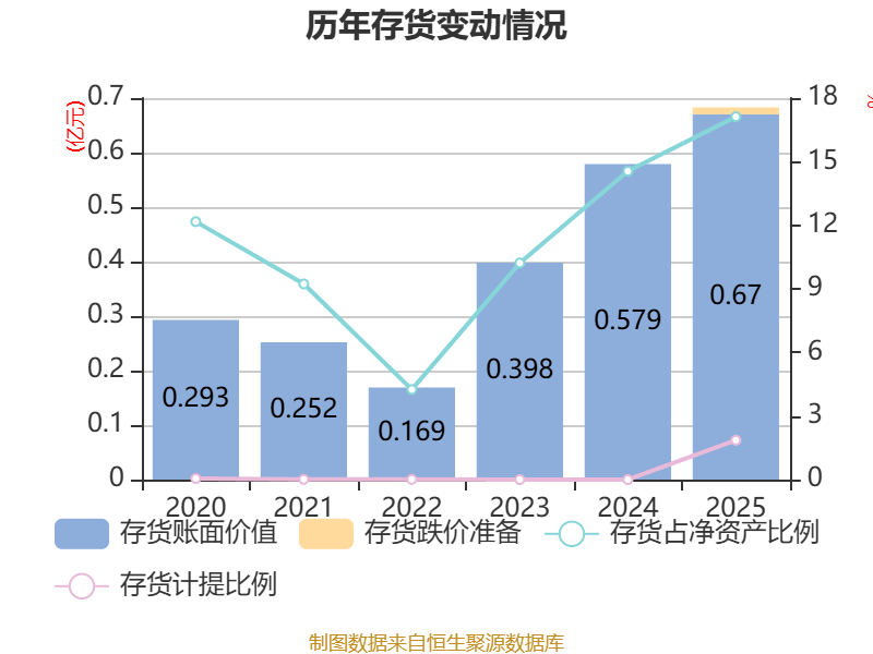 从存货变动来看,截至2025年末,公司存货账面价值为6702.97万元,占净资产的17.12%,较上年末增加908.13万元。其中,存货跌价准备为126.82万元,计提比例为1.86%。