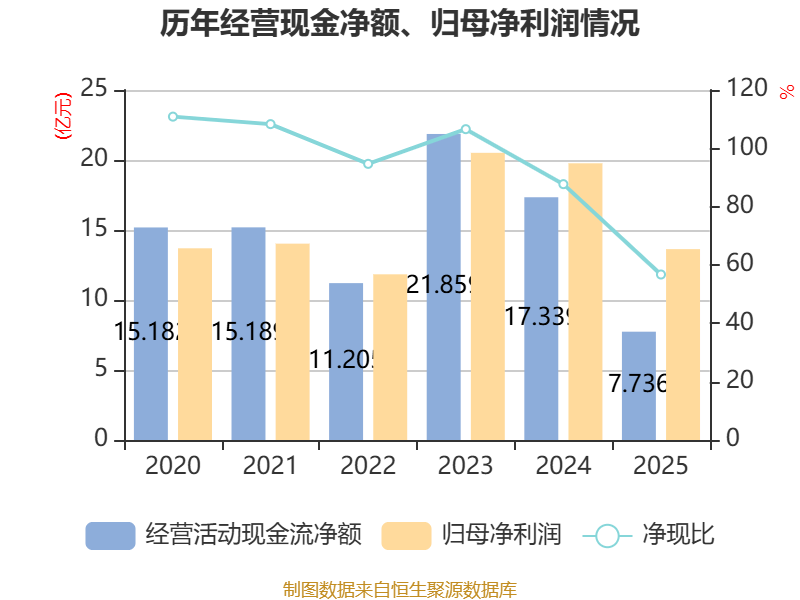 截至2025年,公司经营活动现金流净额为7.74亿元,同比下降55.38%;筹资活动现金流净额2.3亿元,同比增加10.3亿元;投资活动现金流净额-1.59亿元,上年同期为-3.52亿元。