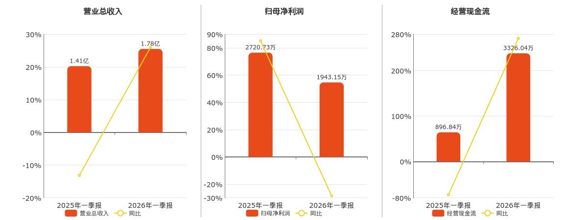 公司营业总收入为1.78亿元。归母净利润为1943.15万元,较去年同报告期归母净利润减少777.58万元,同比较去年同期下降28.58%。经营活动现金净流入为3326.04万元。