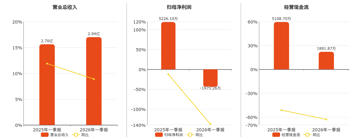 公司营业总收入为2.94亿元,较去年同报告期营业总收入增加2398.56万元,实现2年连续上涨,同比较去年同期上涨8.88%。归母净利润为-1975.26万元。经营活动现金净流入为1891.87万元。
