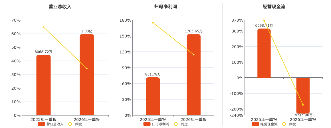 公司营业总收入为1.08亿元,较去年同报告期营业总收入增加2769.33万元,实现2年连续上涨,同比较去年同期上涨34.32%。归母净利润为1783.65万元,较去年同报告期归母净利润增加951.87万元,实现2年连续上涨,同比较去年同期上涨114.44%。经营活动现金净流入为-4743.06万元。