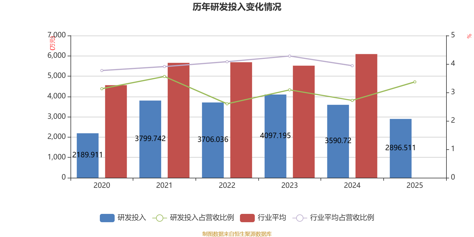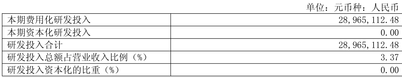 2025年全年,公司研发投入金额为2896.51万元,同比下降19.33%;研发投入占营业收入比例为3.37%,相比上年同期上升0.65个百分点。此外,公司全年研发投入资本化率为0%。