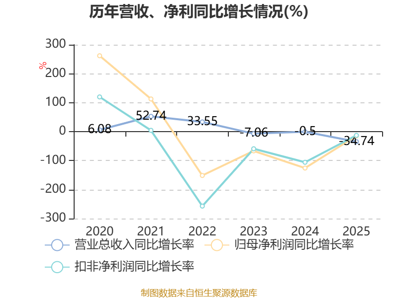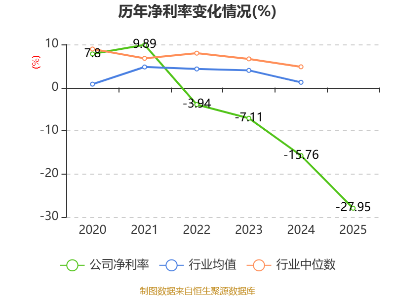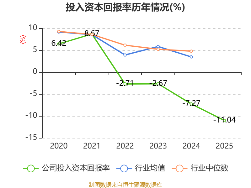数据显示,2025年公司加权平均净资产收益率为-17.33%,较上年同期下降4.44个百分点。公司2025年投入资本回报率为-11.04%,较上年同期下降3.77个百分点。