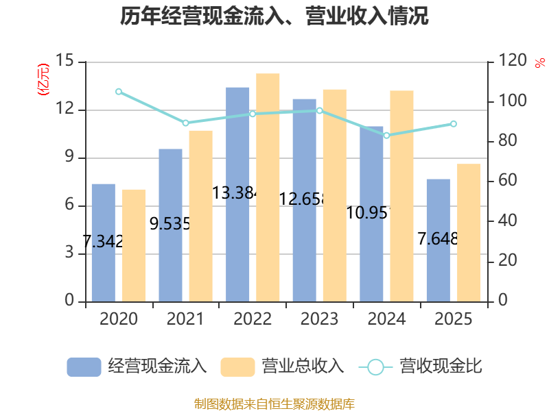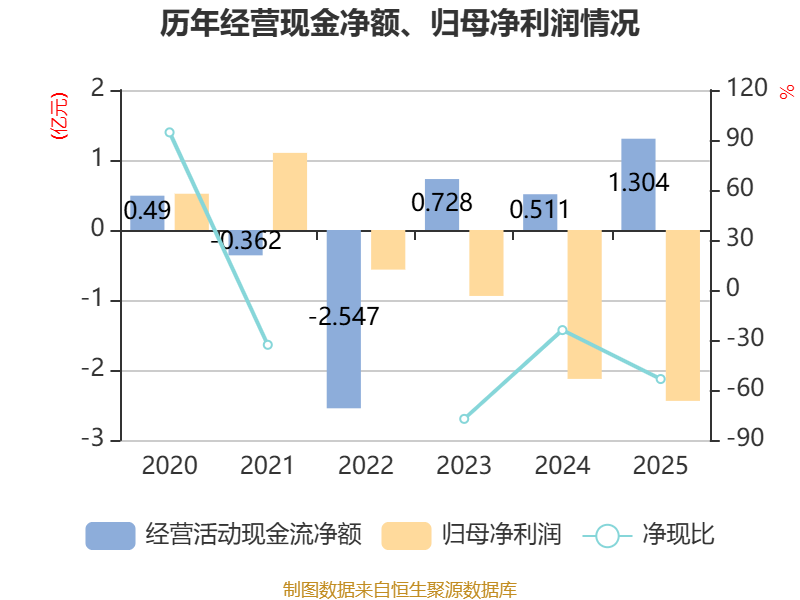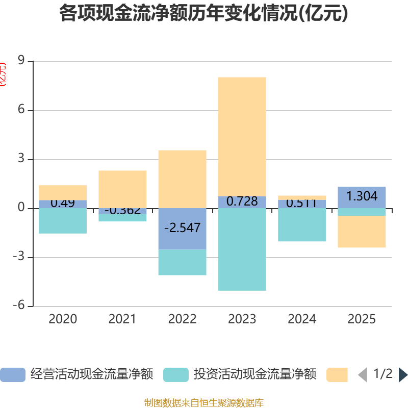 截至2025年,公司经营活动现金流净额为1.3亿元,同比增长155.03%;筹资活动现金流净额-1.93亿元,同比减少2.18亿元;投资活动现金流净额-4899.81万元,上年同期为-2.04亿元。