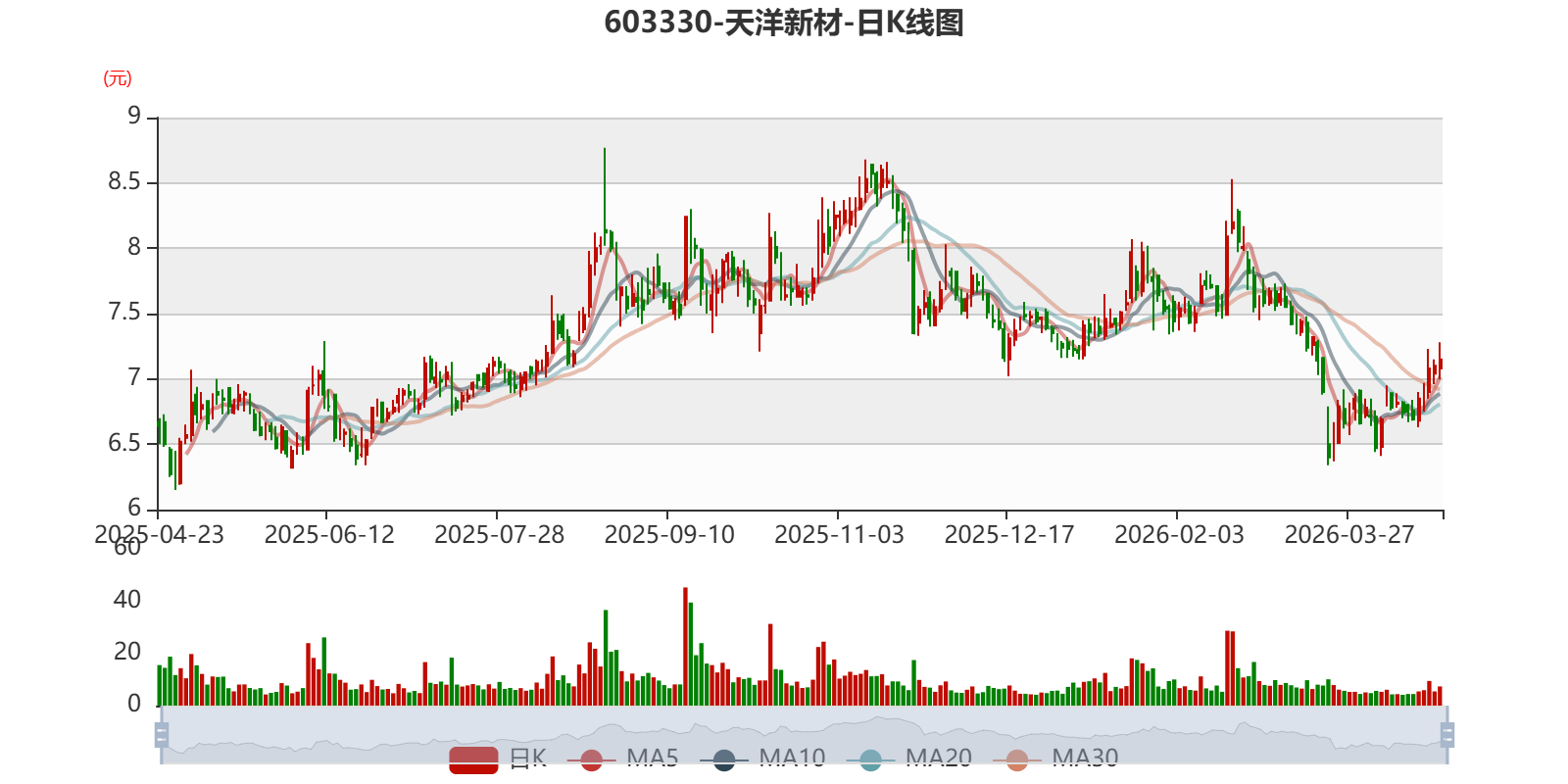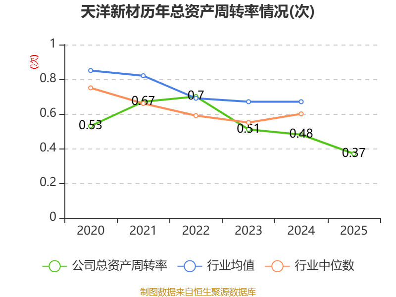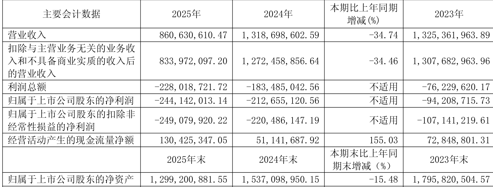 中证智能财讯天洋新材(603330)4月23日披露2025年年度报告。2025年,公司实现营业总收入8.61亿元,同比下降34.74%;归母净利润亏损2.44亿元,上年同期亏损2.13亿元;扣非净利润亏损2.49亿元,上年同期亏损2.2亿元;经营活动产生的现金流量净额为1.3亿元,同比增长155.03%;报告期内,天洋新材基本每股收益为-0.59元,加权平均净资产收益率为-17.33%。