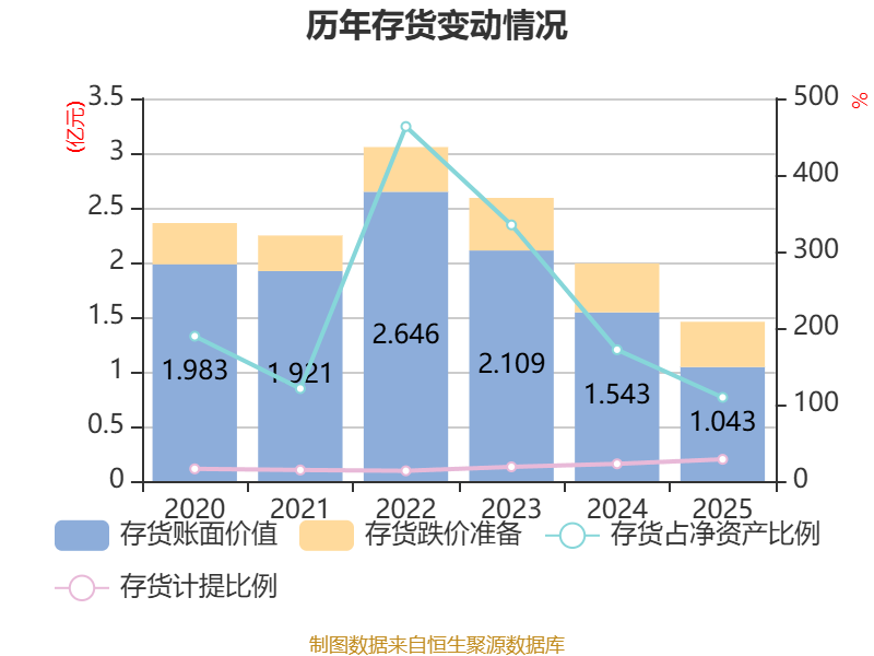 从存货变动来看,截至2025年末,公司存货账面价值为1.04亿元,占净资产的109.34%,较上年末减少4999.35万元。其中,存货跌价准备为4143.08万元,计提比例为28.43%。