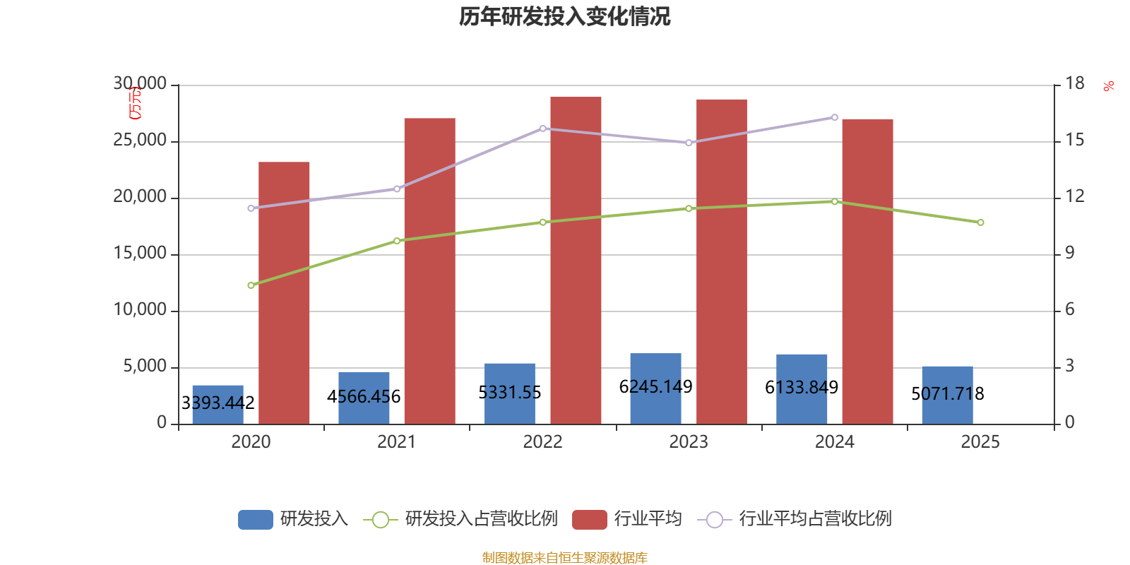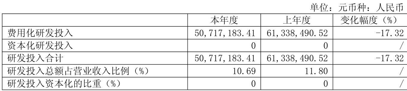 2025年全年,公司研发投入金额为5071.72万元,同比下降17.32%;研发投入占营业收入比例为10.69%,相比上年同期下降1.11个百分点。此外,公司全年研发投入资本化率为0%。