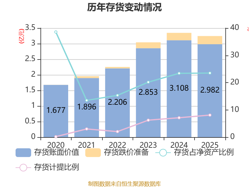 从存货变动来看,截至2025年末,公司存货账面价值为2.98亿元,占净资产的23.5%,较上年末减少1253.19万元。其中,存货跌价准备为2622.6万元,计提比例为8.08%。