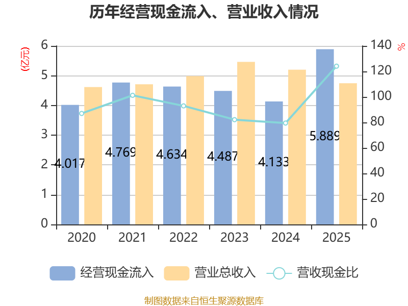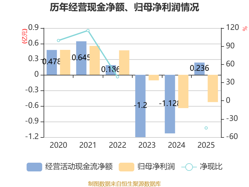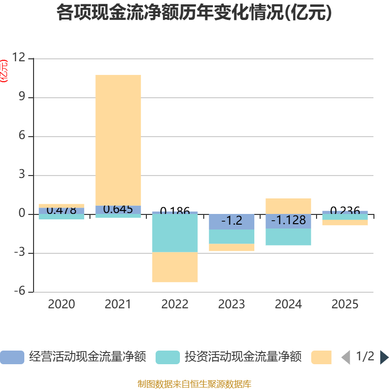 截至2025年,公司经营活动现金流净额为2355.56万元,同比增加1.36亿元;筹资活动现金流净额-4224.92万元,同比减少1.62亿元;投资活动现金流净额-4500.18万元,上年同期为-1.29亿元。