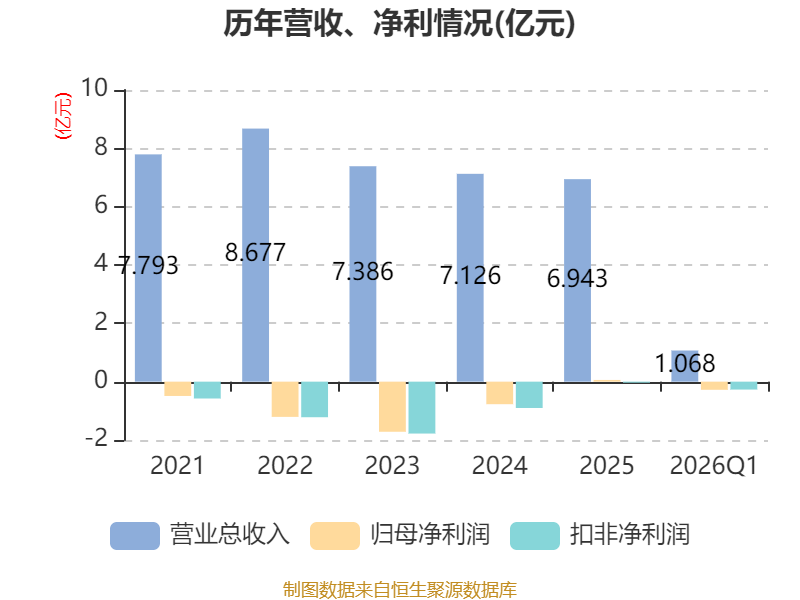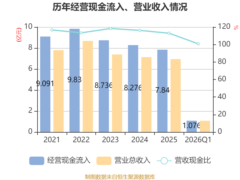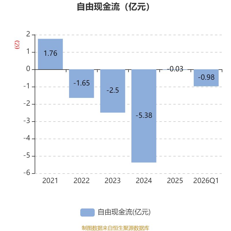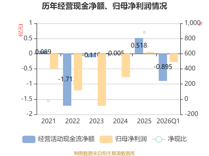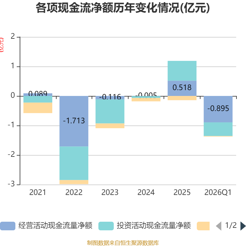 截至2026年一季度末,公司经营活动现金流净额为-8949.86万元,同比减少6581.1万元;筹资活动现金流净额-186.74万元,同比增加29.71万元;投资活动现金流净额-4632.82万元,上年同期为2460.9万元。