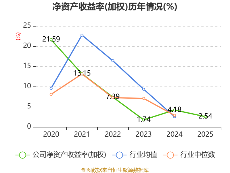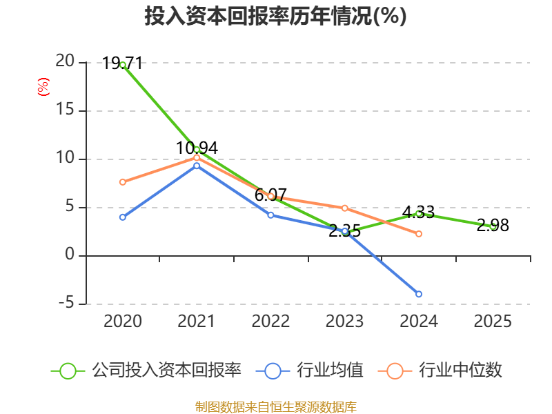 数据显示,2025年公司加权平均净资产收益率为2.54%,较上年同期下降1.64个百分点。公司2025年投入资本回报率为2.98%,较上年同期下降1.35个百分点。
